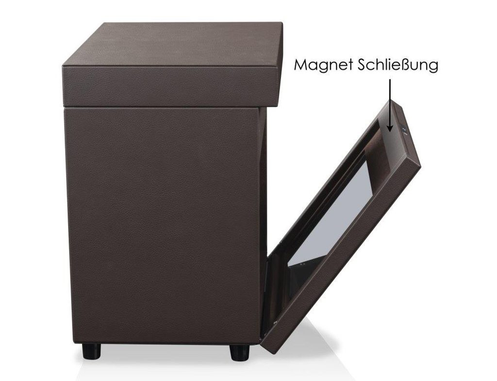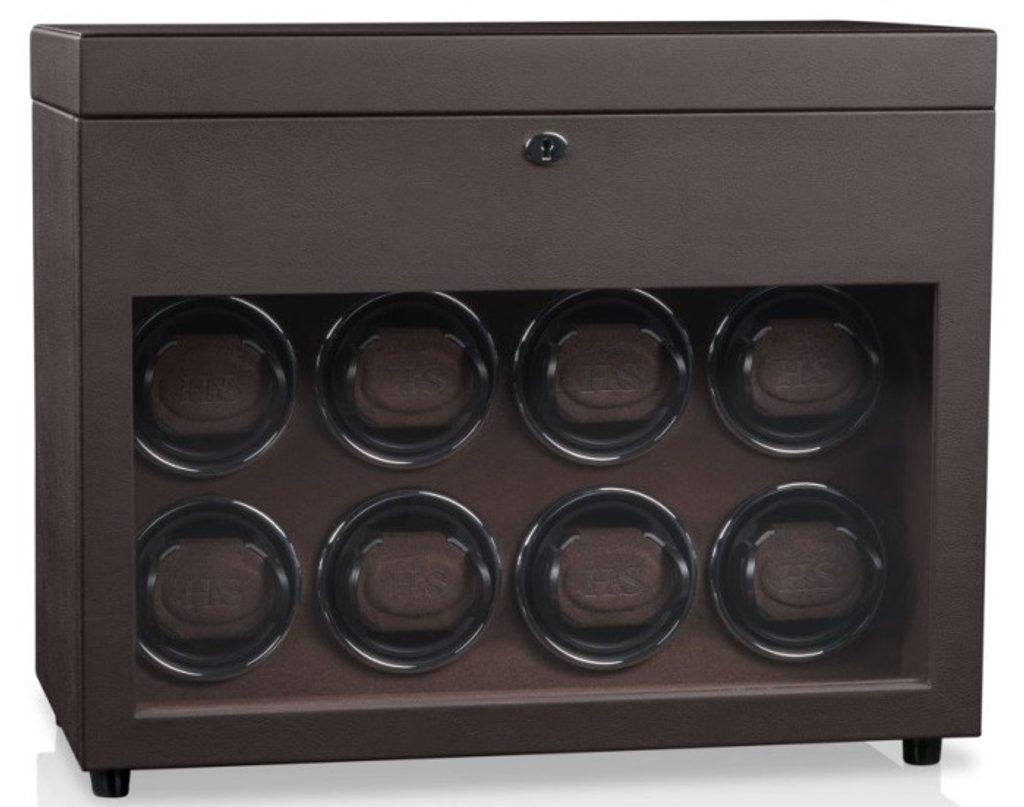 Naťahovač Heisse & Söhne Vancouver 8 70019-206.141.141 hnedej farby, na 8 kusov mechanických hodiniek s automatickým naťahovaním. Pod horným vekom nájdeme úložný priestor na ďalších šesť hodiniek. Mäkké podložky pod hodinky v hornom priestore majú na oboch stranách pochrómované vodiace kolíky, ktoré zabraňujú skĺznutiu hodiniek. Natáčač je potiahnutý kvalitnou imitáciou kože hnedej farby s hnedým interiérom.