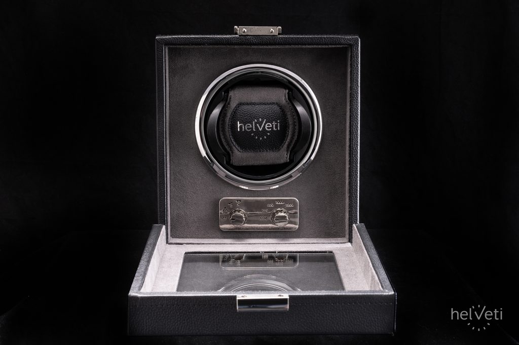 Čierny naťahovač Helveti pre 1 kus mechanických hodiniek s automatickým naťahovaním. Je potiahnutý čiernou štruktúrovanou pravou kožou, vnútro je vystlané mäkkým tmavosivým velúrom. Hodinky je možné sledovať pomocou priehľadného veka.
