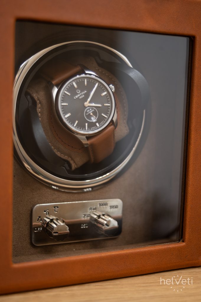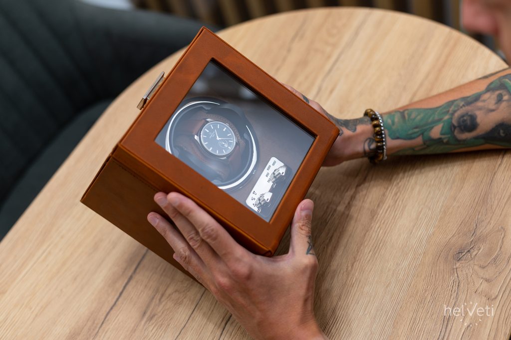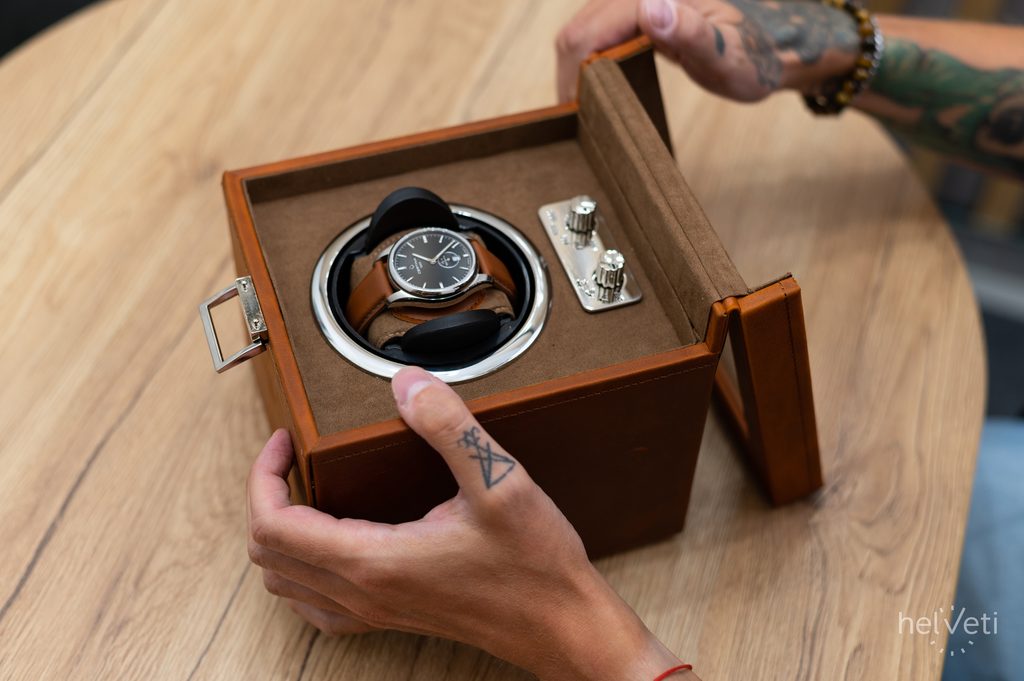 Čierny naťahovač Helveti pre 1 kus mechanických hodiniek s automatickým naťahovaním. Je potiahnutý tmavohnedou štruktúrovanou pravou kožou, vnútro je vystlané mäkkým tmavohnedým velúrom. Hodinky je možné sledovať pomocou priehľadného veka.