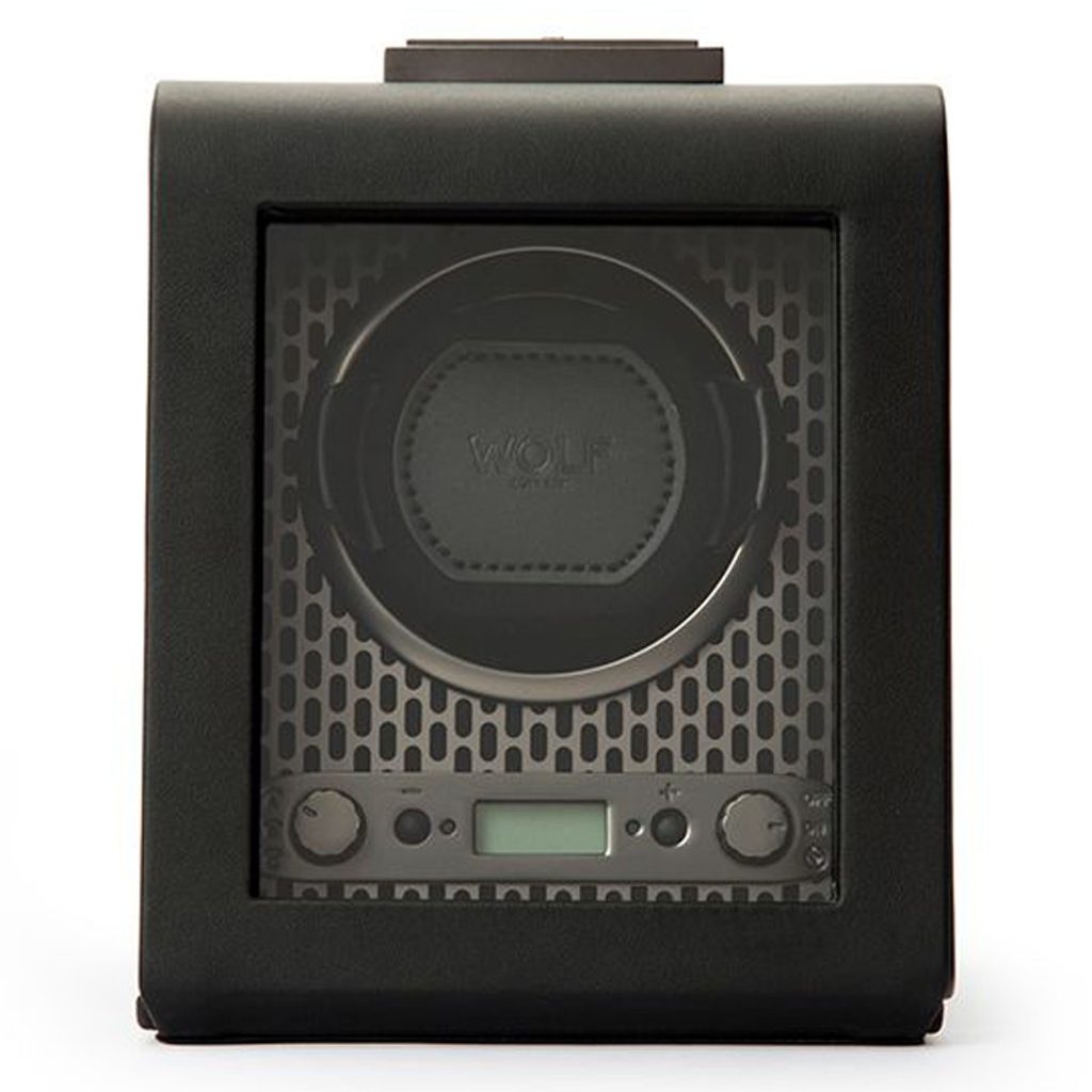 Naťahovač Wolf Axis 469103 čierny, pre 1 kus mechanických hodiniek s automatickým naťahovaním. Naťahovač bol navrhnutý tak, aby sa do neho zmestili aj väčšie hodinky (puzdro do 52 mm). Nová konštrukcia "uzamyká" manžetu do rotačného bubna pre bezpečné uchytenie. Penová podložka s nízkou hustotou sa ľahko prispôsobí akémukoľvek obvodu hodiniek bez zbytočného tlaku na sponu.