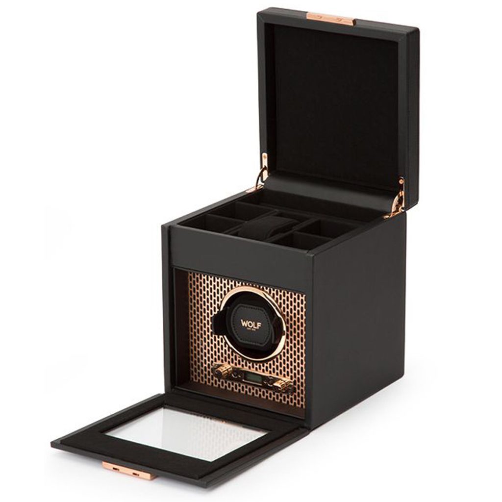 Naťahovač Wolf Axis 469216 čierny, pre 1 kus mechanických hodiniek s automatickým naťahovaním. Naťahovač bol navrhnutý tak, aby sa do neho zmestili aj väčšie hodinky (puzdro do 52 mm). Nová konštrukcia "uzamyká" manžetu do rotačného bubna pre bezpečné uchytenie. Penová podložka s nízkou hustotou sa ľahko prispôsobí akémukoľvek obvodu hodiniek bez zbytočného tlaku na sponu.
