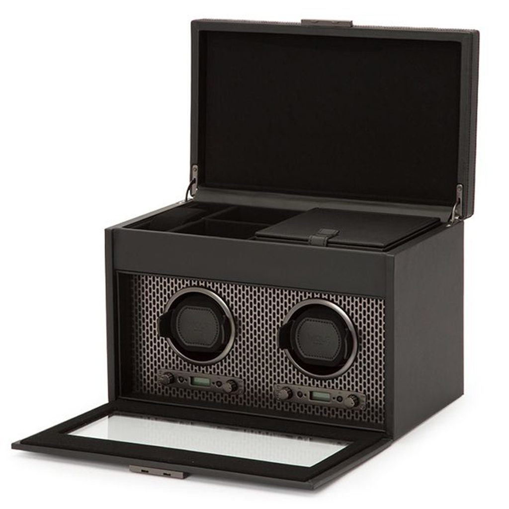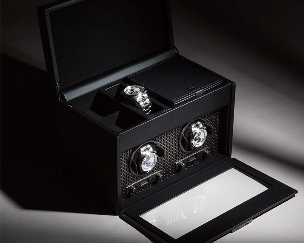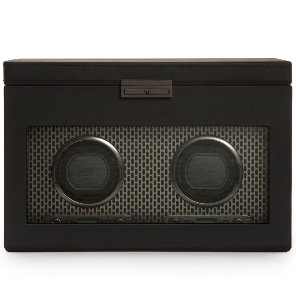 Naťahovač Wolf Axis 469303 čierny, na 2 kusy mechanických hodiniek s automatickým naťahovaním. Naťahovač bol navrhnutý tak, aby sa do neho zmestili aj väčšie hodinky (puzdro do 52 mm). Nová konštrukcia "uzamyká" manžetu do rotačného bubna pre bezpečné uchytenie. Penová podložka s nízkou hustotou sa ľahko prispôsobí akémukoľvek obvodu hodiniek bez zbytočného tlaku na sponu