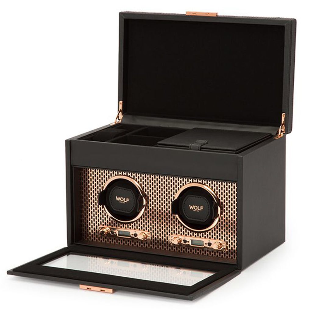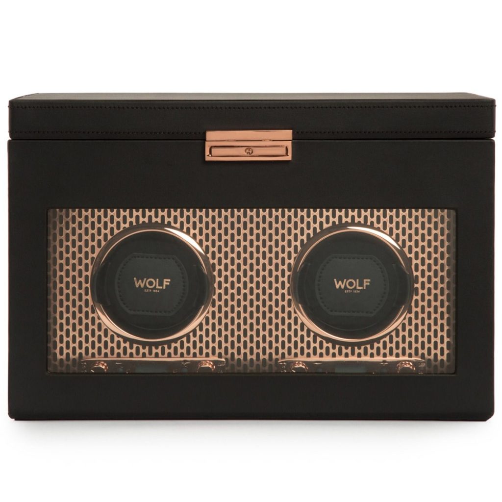 Naťahovač Wolf Axis 469316 čiernej farby, pre 2 kusy mechanických hodiniek s automatickým náťahom. Naťahovač bol navrhnutý tak, aby sa doň zmestili aj väčšie hodinky (puzdro až 52 mm). Nový dizajn „uzamkne“ manžetu do bubna rotátora pre bezpečné uchytenie. Vankúšik z peny s nízkou hustotou sa ľahko prispôsobí akémukoľvek obvodu hodiniek bez toho, aby vyvíjal nadbytočný tlak na sponu.