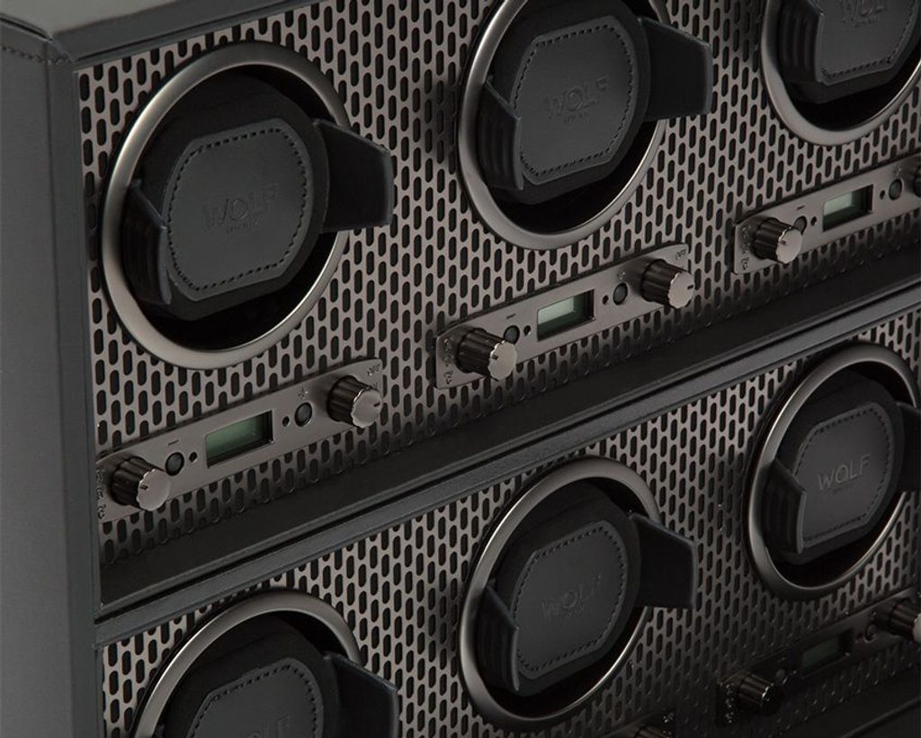 Naťahovač Wolf Axis 469603 čierny, na 6 kusov mechanických hodiniek s automatickým naťahovaním. Naťahovač bol navrhnutý tak, aby sa do neho zmestili aj väčšie hodinky (puzdro do 52 mm). Nová konštrukcia "uzamyká" manžetu do rotačného bubna pre bezpečné uchytenie. Penová podložka s nízkou hustotou sa ľahko prispôsobí akémukoľvek obvodu hodiniek bez toho, aby vyvíjala nadmerný tlak na sponu.
