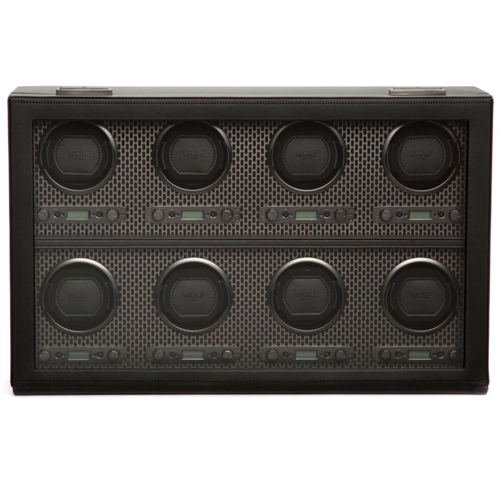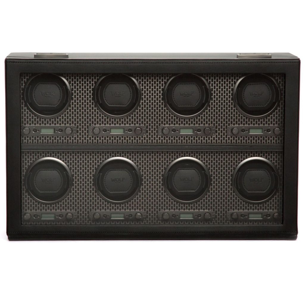 Naťahovač Wolf Axis 469703 čierny, na 8 kusov mechanických hodiniek s automatickým naťahovaním. Naťahovač bol navrhnutý tak, aby sa do neho zmestili aj väčšie hodinky (puzdro do 52 mm). Nová konštrukcia "uzamyká" manžetu do rotačného bubna pre bezpečné uchytenie. Penová podložka s nízkou hustotou sa ľahko prispôsobí akémukoľvek obvodu hodiniek bez zbytočného tlaku na sponu.