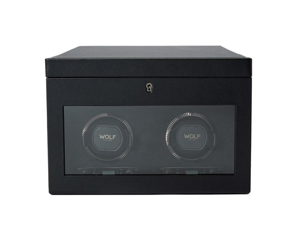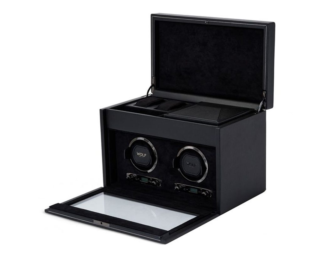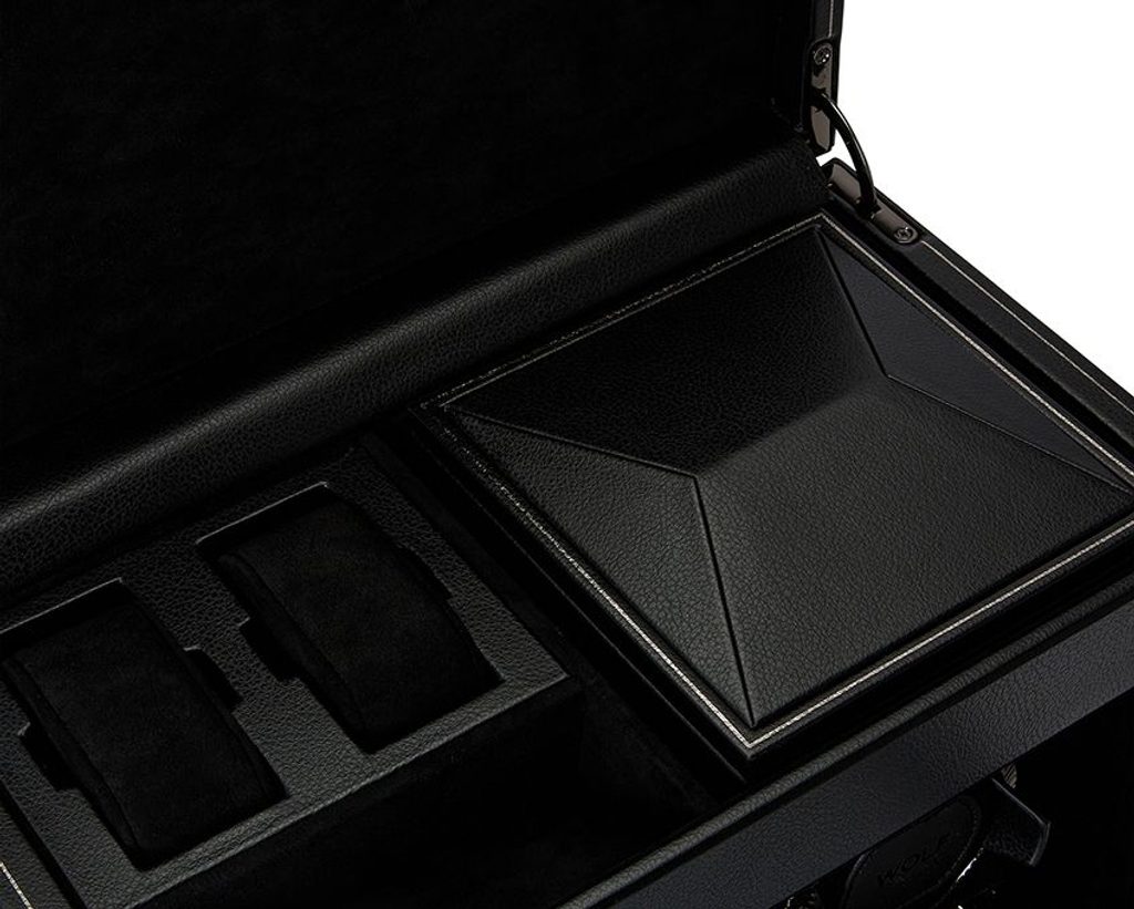 Elegantný naťahovač Wolf British Racing Black 792202 má 2 naťahovacie moduly pre mechanické hodinky s automatickým naťahovaním. Nový dizajn "uzamyká" manžetu do rotačného bubna pre bezpečné uchytenie. V naťahovači je tiež priestor na uloženie ďalších 2 hodiniek s maximálnym priemerom puzdra 52 mm. Pod hlavným vekom naťahovača sa nachádza aj 1 otvorená priehradka, 1 cestovné puzdro na 1 hodinky a 1 malá priehradka s vekom.