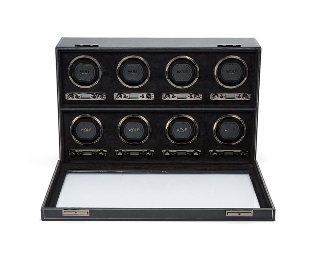 Elegantný naťahovač Wolf British Racing Black 792502 má 8 naťahovacích modulov pre mechanické hodinky s automatickým naťahovaním. Nový dizajn "uzamyká" manžetu do rotačného bubna pre bezpečné uchytenie.