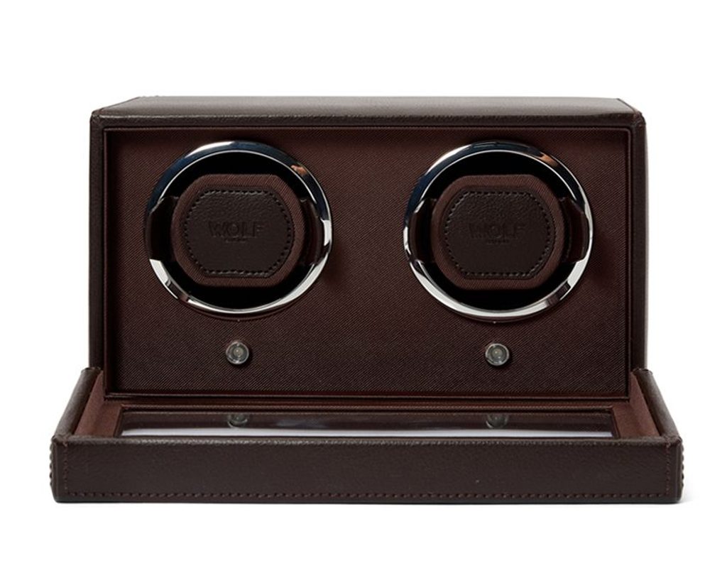 Natahovací strojček Wolf Double Cub 461206 hnedý, na 2 kusy mechanických hodiniek s automatickým naťahovaním. Nový dizajn "uzamyká" manžetu do rotačného bubna pre bezpečné uchytenie.