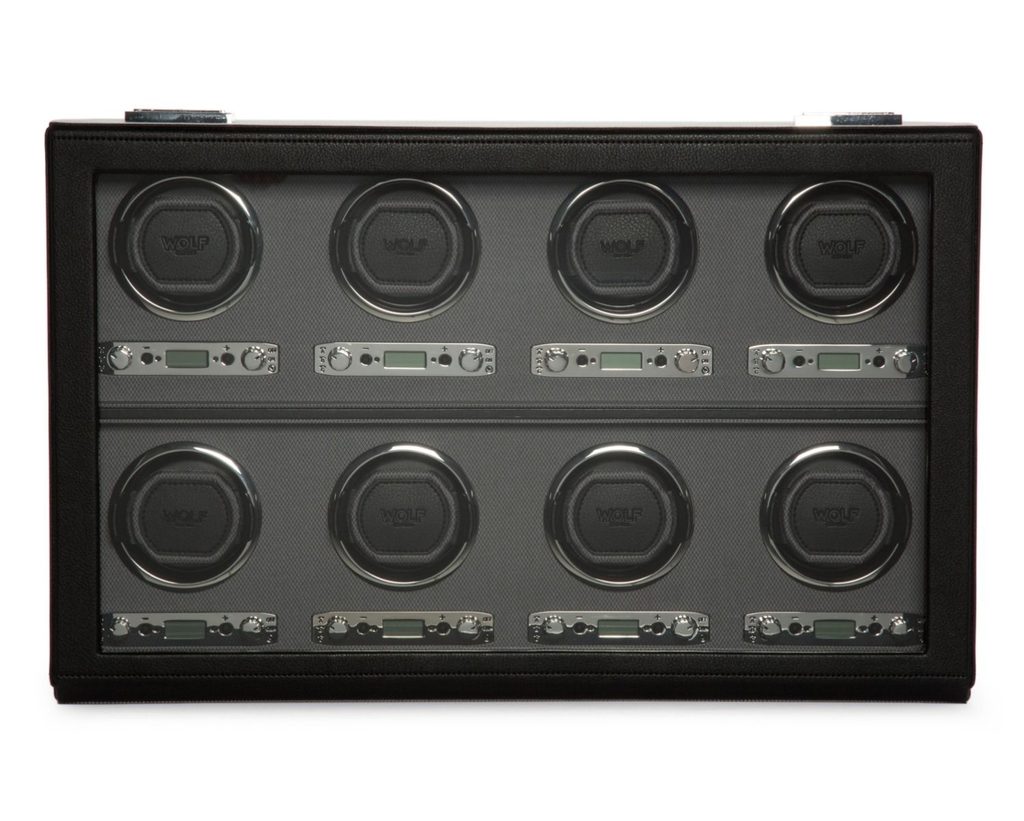 Naťahovač Wolf Viceroy 456902 potiahnuté kvalitnou vegánskou kožou, pre 8 kusov mechanických hodiniek s automatickým naťahovaním. Nový dizajn "uzamkne" manžetu do rotátorového bubienka pre bezpečné uchytenie. Penová podložka s nízkou hustotou sa ľahko prispôsobí akémukoľvek obvodu hodiniek bez zbytočného tlaku na sponu. Súčasťou naťahovača je aj úložný priestor na päť ďalších hodiniek a cestovné puzdro.