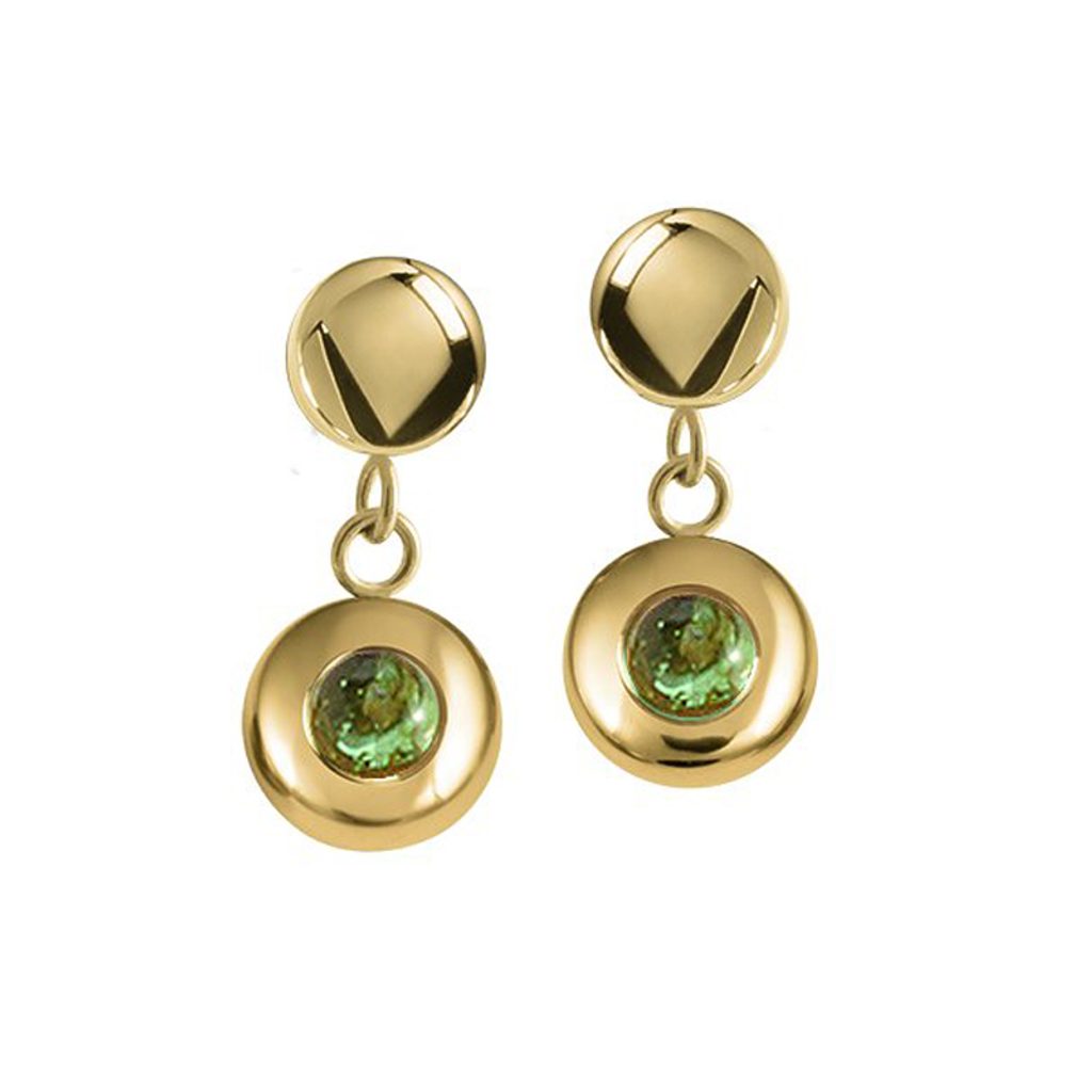 Visiace titánové náušnice Boccia Titanium 05051-04 sú pozlátené a zdobené zeleným turmalínom (verdelitom) s hmotnosťou približne 0,3 karátu.