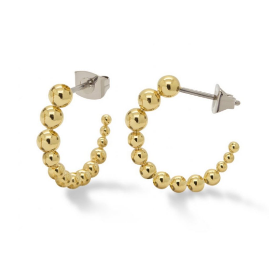 Náušnice sa pýšia originálnym tvarom polmesiaca, ktorý tvoria malé pozlátené guľôčky. Náušnice sú vyrobené z kvalitného titánu, ktorý je ľahký, pevný odolný a zároveň hypoalergénny, čo ocenia najmä ľudia so zvýšenou citlivosťou na kovy.