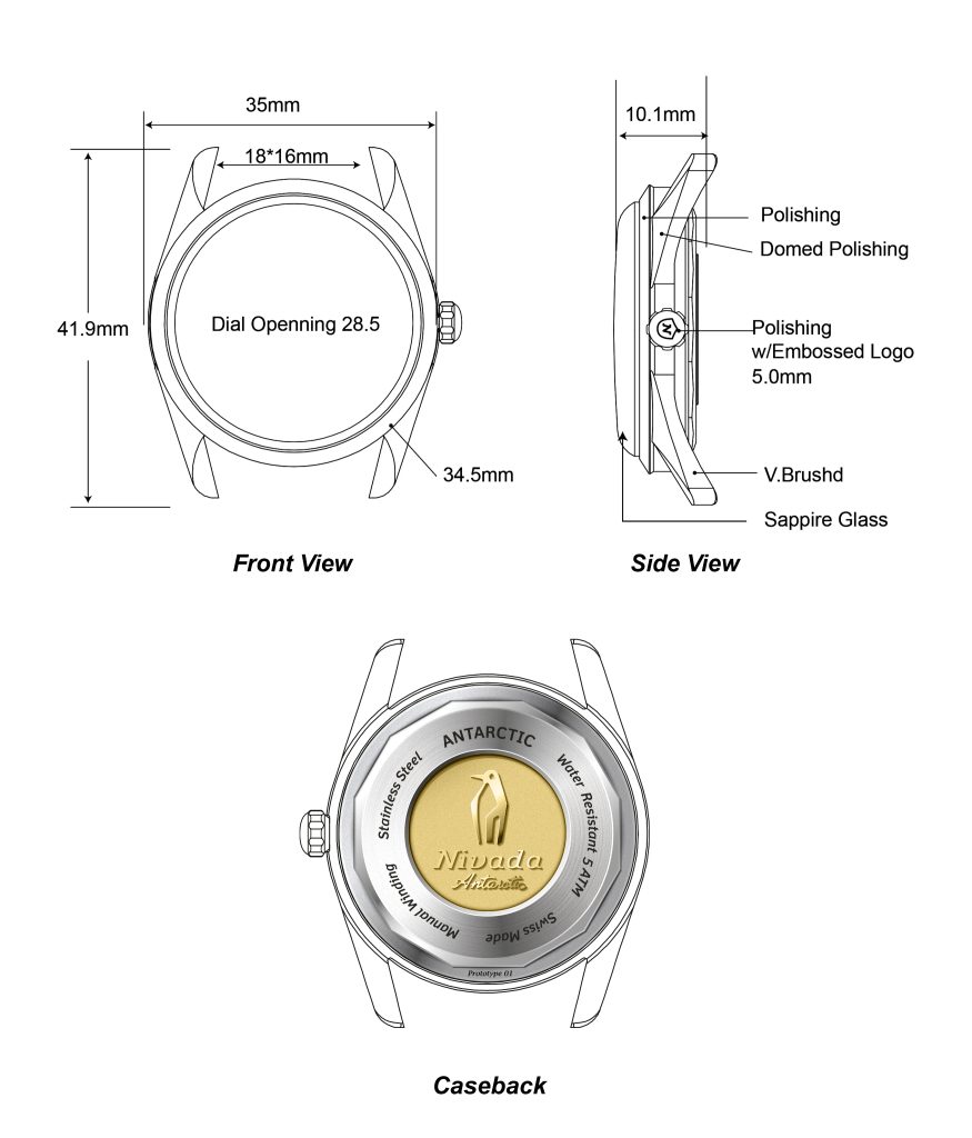Model Antarctic má stredne veľké puzdro s priemerom 35 mm a hrúbkou 10 mm (so sklíčkom) , vyrobené z nehrdzavejúcej ocele 316 s lešteným a brúseným povrchom. Vo vnútri hodiniek pracuje automatický strojček Landeron 21. Model má vodotesnosť 5 ATM.