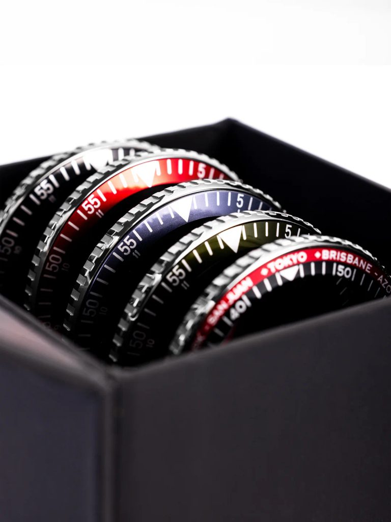 Hodinky sa dodávajú s piatimi vymeniteľnými lunetami - čiernou, červenou, zelenou, modrou a čierno-červenou.