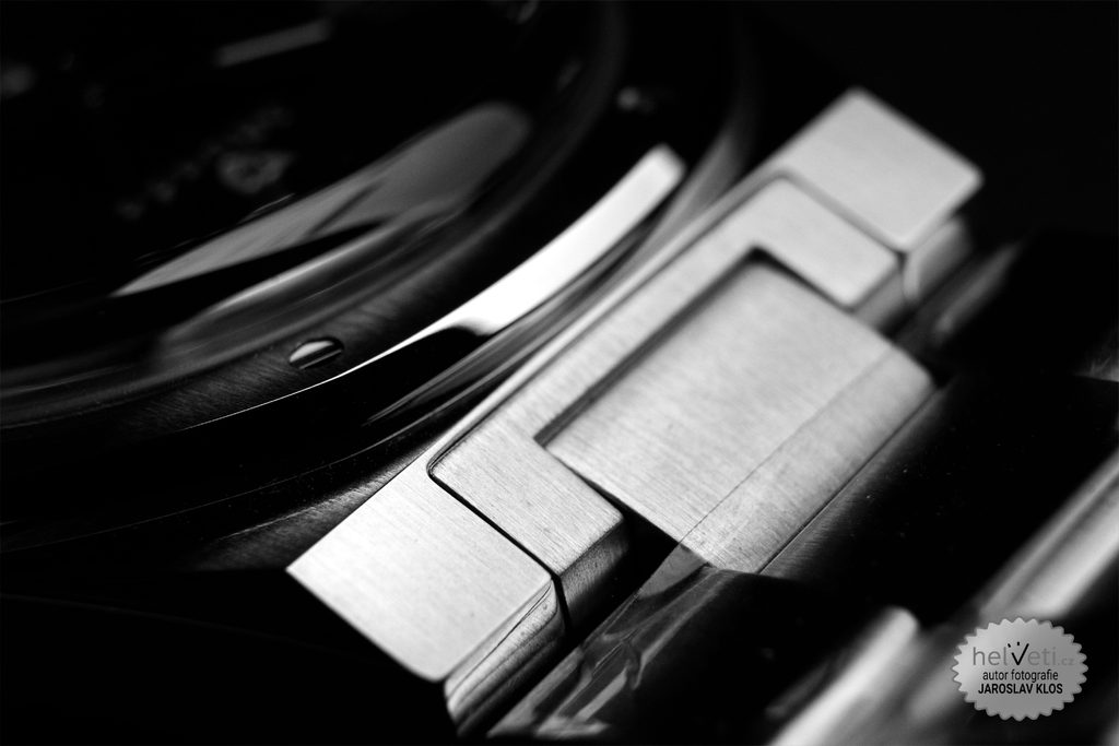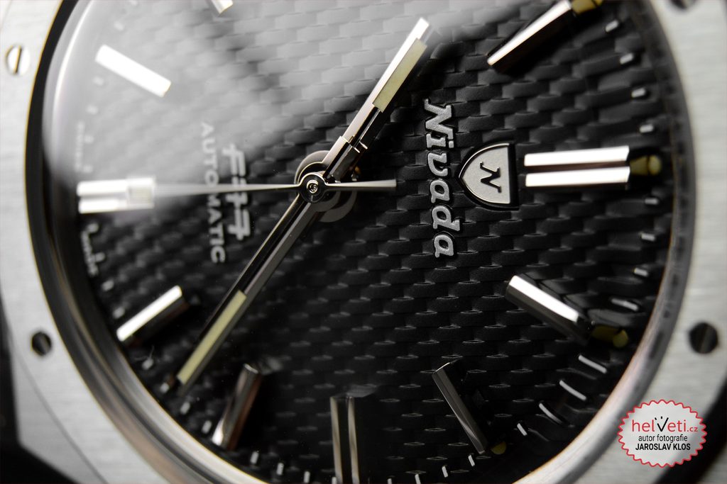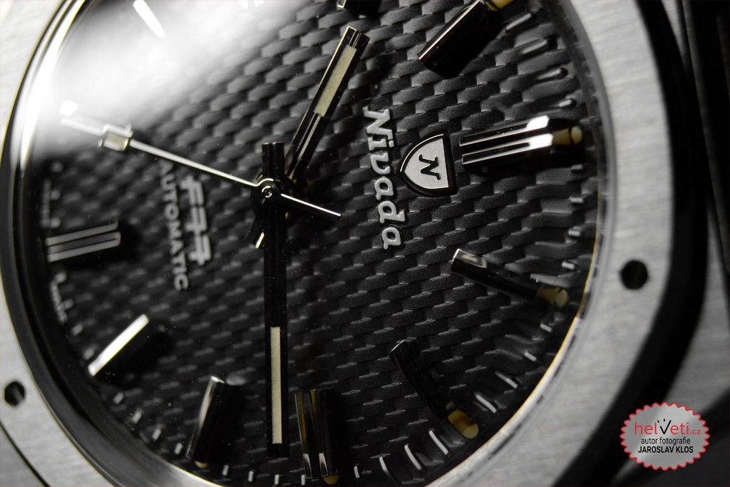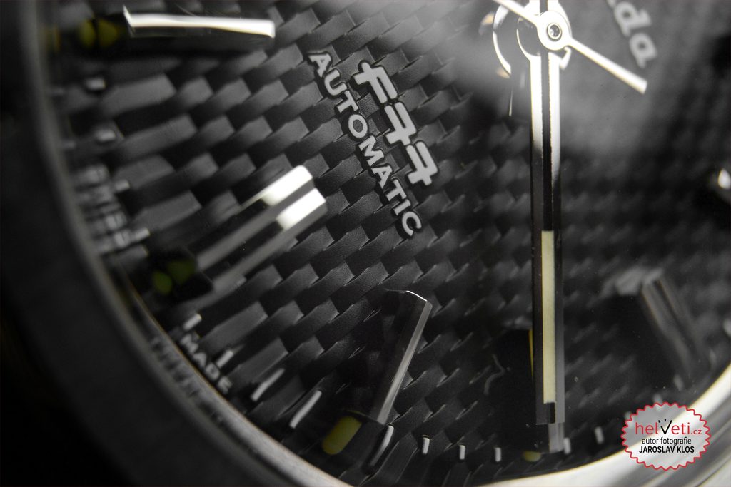 Detailný čierny ciferník s karbónovým vzorom v sebe nesie veľkú dávku elegancie, ktorú podporujú aj lesklé strieborné indexy a ručičky vyplnené bielou luminiscenčnou vrstvou.