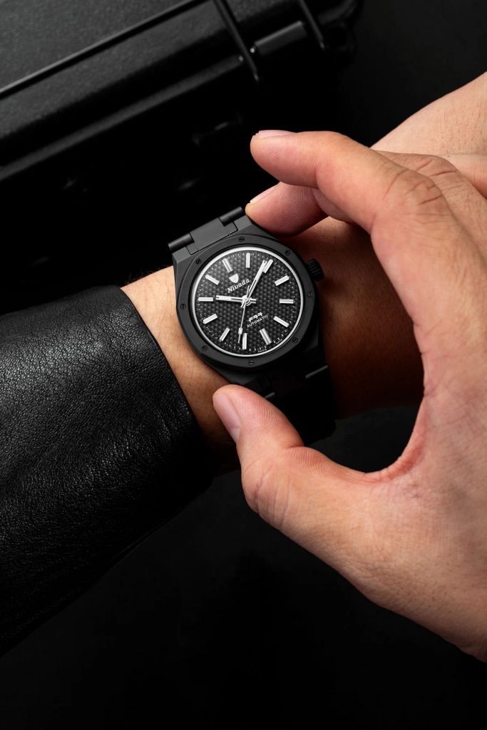 HodinkyF77 Black Ceramic s čiernym opleteným ciferníkom v karbónovom štýle sú modernou poctou vintage dizajnu. Inšpirovaný zložitými textúrami klasických hodiniek vytvára ciferník s opleteným efektom jemnú a mužnú estetiku pripomínajúcu karbónové vlákna. Tento výrazný dizajn je uložený v 37 mm matnom čiernom keramickom puzdre, ktoré je známe svojou tuhosťou a odolnosťou proti poškriabaniu. Tento model F77, doplnený hrubými indexmi v tvare prútov a striebornými ručičkami odrážajúcimi svetlo, vyvažuje eleganciu s odvážnym, moderným nádychom.