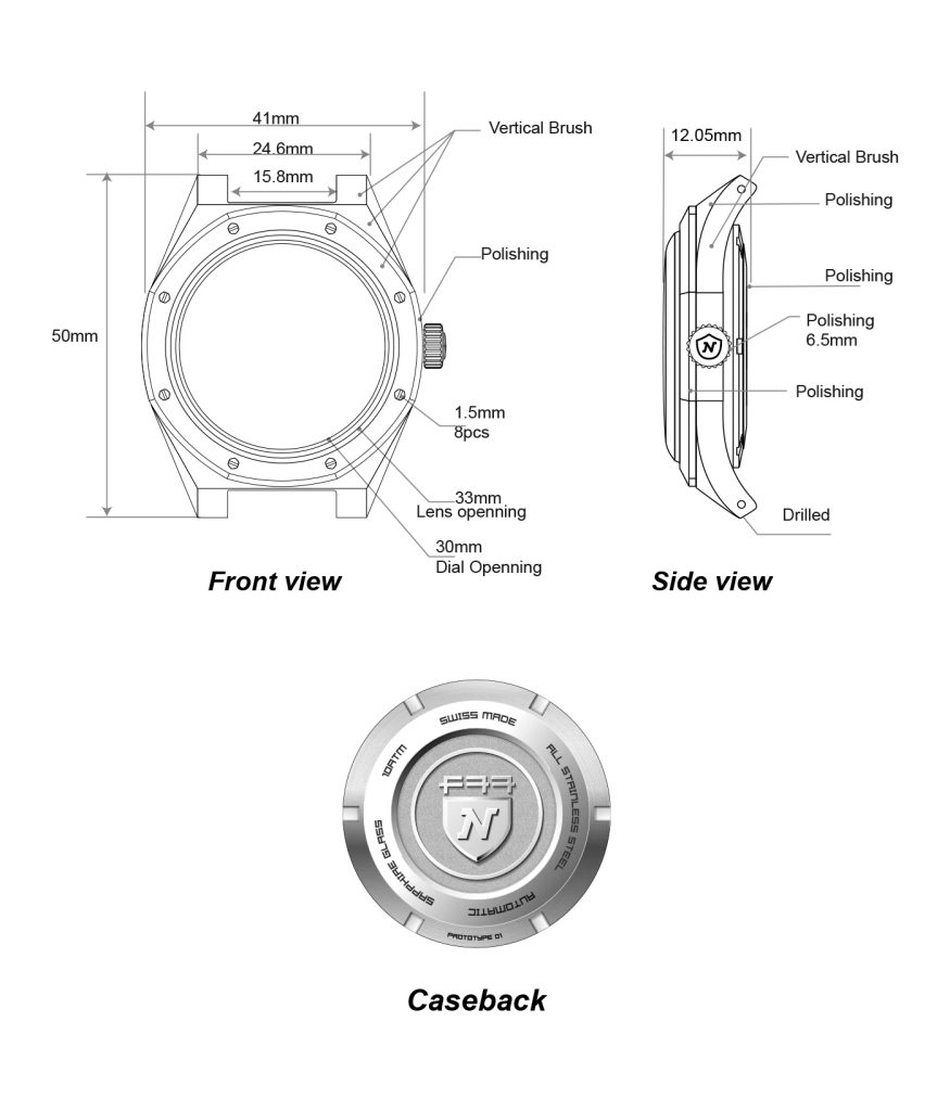 Puzdro z ušľachtilej ocele 316 s priemerom 41 mm a hrúbkou 12 mm je upravené lešteným a brúseným povrchom. Vo vnútri modelu pracuje automatický strojček SOPROD P024. Celé hodinky chráni kvalitné dvojité zafírové sklíčko, ktoré zaručuje maximálnu ochranu pred poškriabaním.