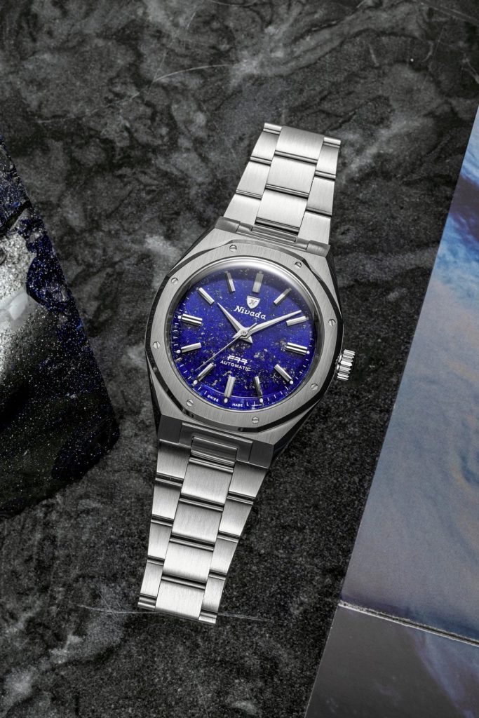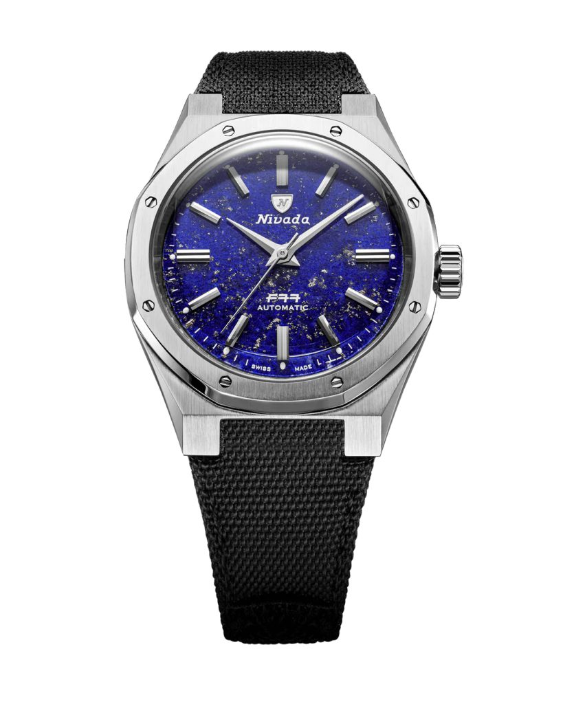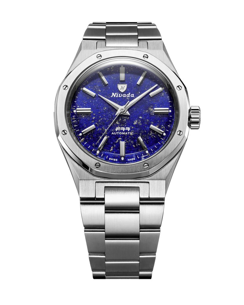 HodinkyF77 Stainless Steel Lapis Lazuli majú ciferník vyrobený z pravého lapisu lazuli, tmavomodrého polodrahokamu ceneného pre svoju bohatú farbu a prírodné zlaté inklúzie. Každý ciferník je jedinečný, so vzorom pripomínajúcim hviezdnu nočnú oblohu, ktorý ponúka dynamický vizuálny zážitok meniaci sa podľa svetla. V kombinácii s aplikovanými striebornými indexmi a ručičkami v štýle paličky vzdáva tento ciferník z prírodného kameňa hold minimalistickej estetike pôvodného modelu z roku 1977.