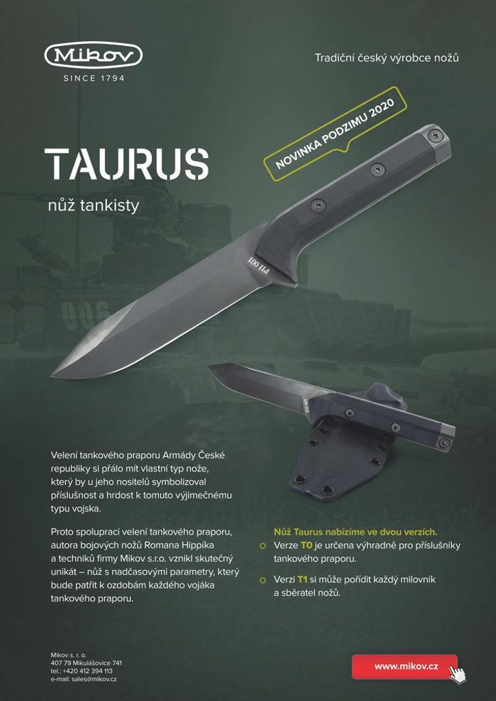 Taurus vznikol na žiadosť velenia tankového práporu českej armády, ktorého želaním bolo, aby nôž symbolizoval príslušnosť a hrdosť na tento výnimočný druh vojska. Nôž s nadčasovým dizajnom v matnom čiernom odtieni má čepeľ vyrobenú z nehrdzavejúcej ocele N690 s tvrdosťou 58-60HRc, ktorá je vybavená spodným a horným rezom. Čepeľ je vyrobená z kompozitného laminátu G-10 v čiernej farbe.