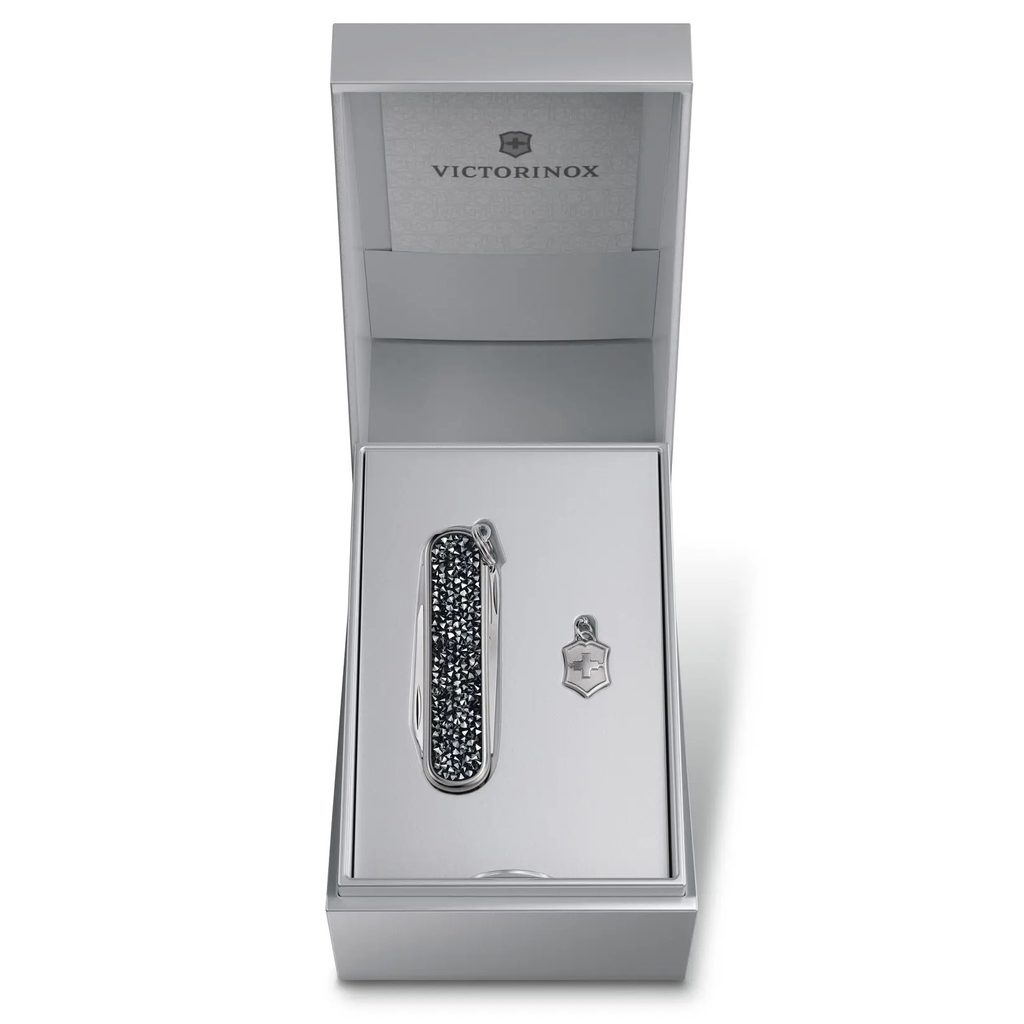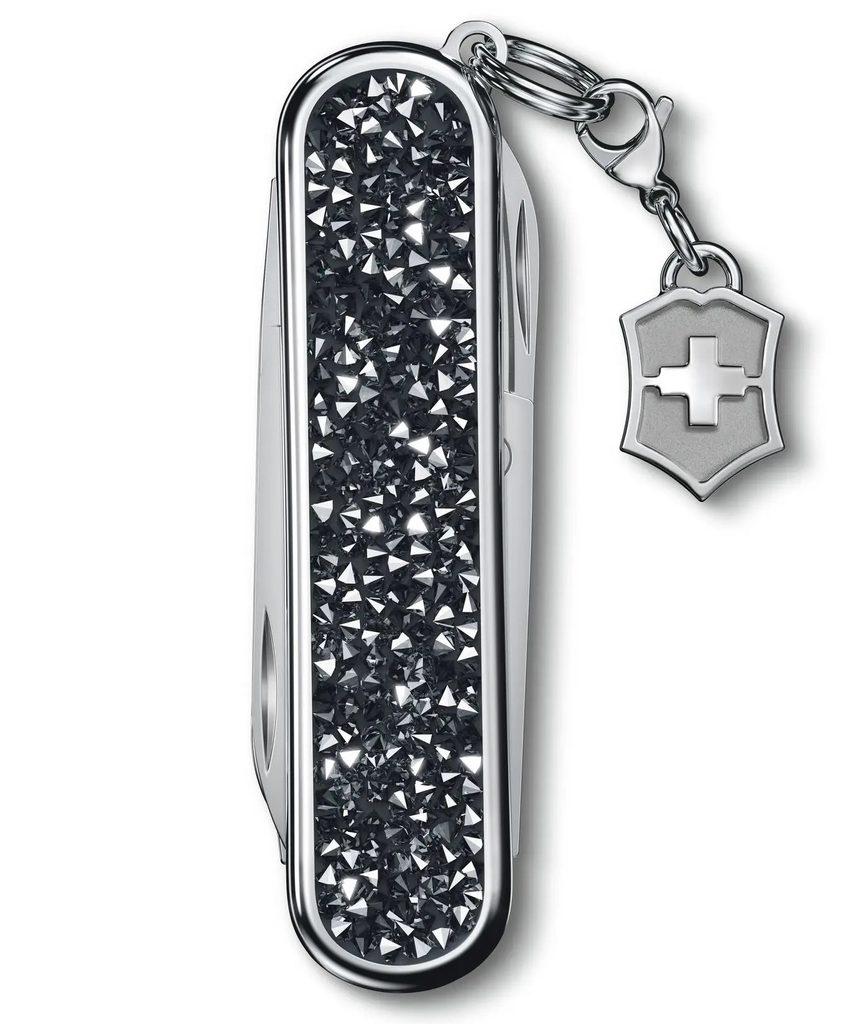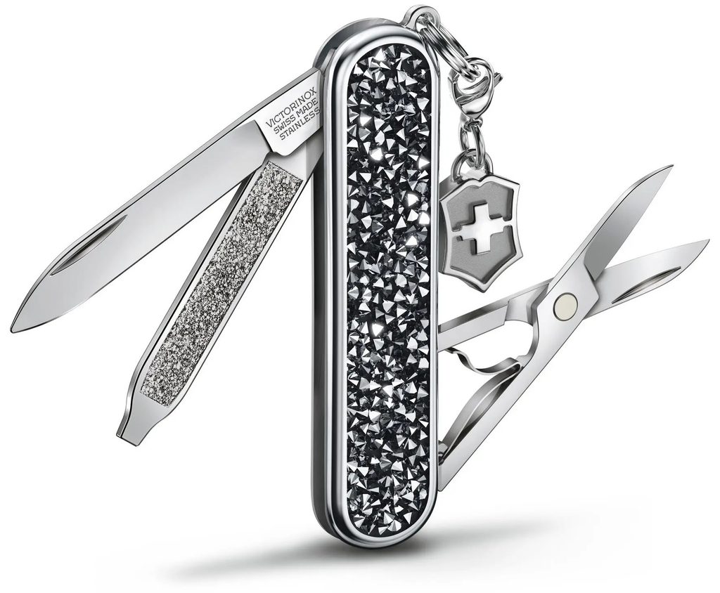 Malý vreckový nôž Victorinox s čepeľou z čiernych trblietavých sklenených kryštálov je elegantným doplnkom a zároveň plnohodnotným nástrojom s 5 funkciami.