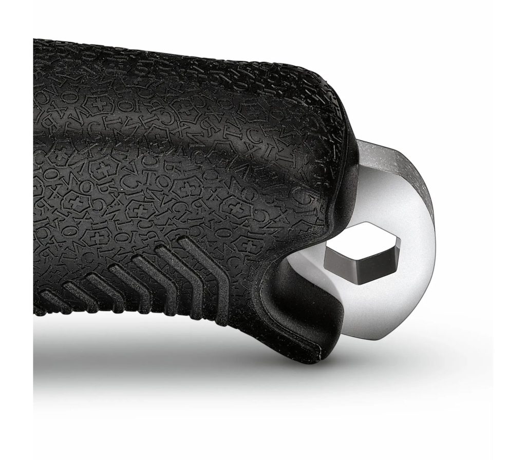 Nôž Victorinox Venture s pevnou čepeľou typu drop point s konštrukciou full tang. Na konci rukoväte je vyčnievajúci tang s: