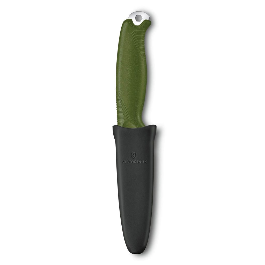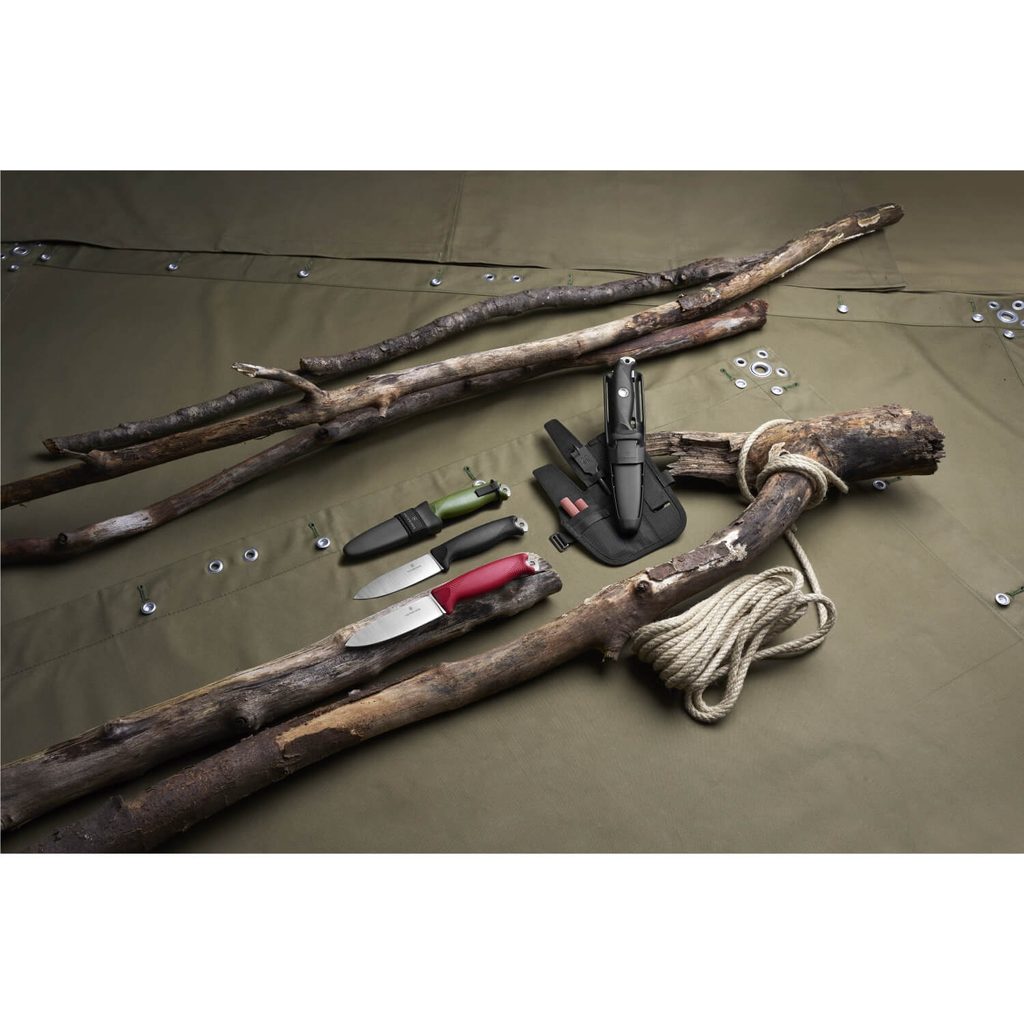 Nôž Victorinox Venture s pevnou čepeľou typu drop point s konštrukciou full tang. Na konci rukoväte je vyčnievajúci tang s: