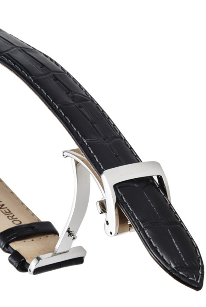 Sofistikovaný, dokonale prehľadný ciferník doplnený jemnými listovými ručičkami je chránený zafírovým sklíčkom s vysokou odolnosťou proti poškriabaniu. Vodotesnosť tohto modelu je 50 m, takže hodinky bez problémov vydržia bežný kontakt s vodou, napríklad dážď, umývanie rúk. Eleganciu hodiniek umocňuje dodávaný kožený remienok s krokodílím vzorom. Priemer puzdra 42,5 mm radí tento model medzi väčšie hodinky.