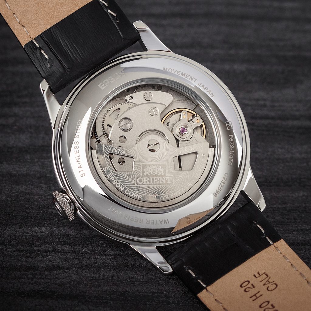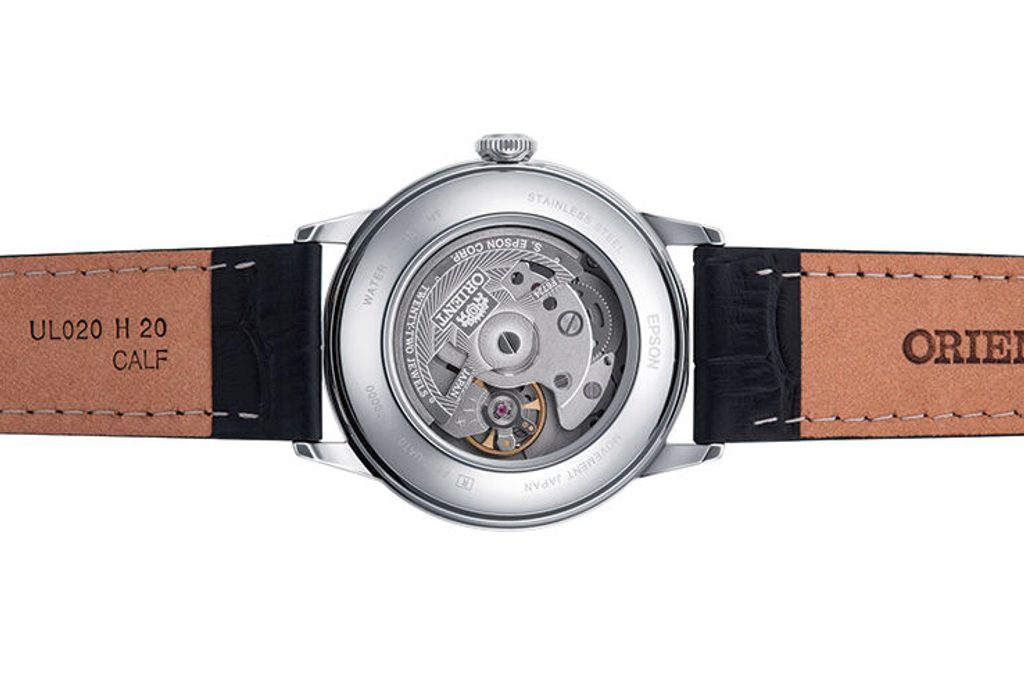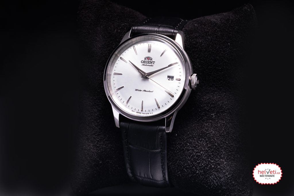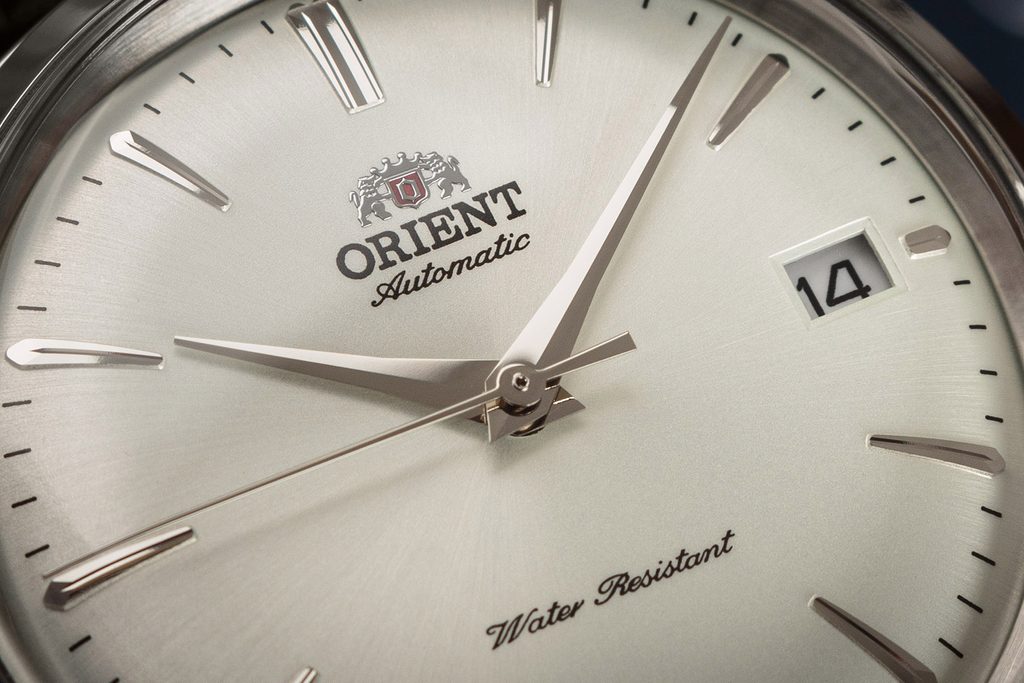 Charakteristickými znakmi hodiniek Orient Bambino sú klenuté sklo, zakrivený ciferník a celkovo jednoduché línie a klasický vzhľad. Nadčasový biely ciferník je cenený pre svoju dobrú prehľadnosť a je chránený minerálnym sklíčkom. Ciferník poteší detailmi v podobe reliéfnych indexov na hodinových pozíciách alebo dauphinských ručičiek. Hodinky sú vybavené ukazovateľom dátumu na pozícii 3 hodín. Vodotesnosť tohto modelu je 30 m, takže hodinky vydržia kontakt s vodou pri umývaní rúk a v daždi. Oceľové puzdro dopĺňa čierny kožený remienok s krokodílím vzorom. Vďaka priemeru puzdra 38,4 mm sú hodinky skvelou voľbou k obleku a hodia sa aj na menšie zápästia.