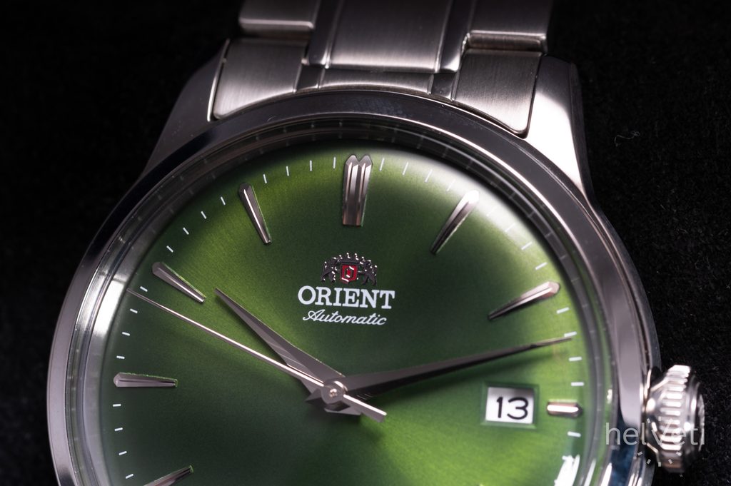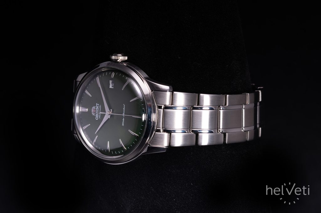 Charakteristickými znakmi hodiniek Orient Bambino sú klenuté sklo, zakrivený ciferník a celkovo jednoduché línie a klasický vzhľad. Osviežujúci zelený ciferník je cenený pre svoju dobrú prehľadnosť a je chránený minerálnym sklíčkom. Ciferník poteší detailmi v podobe reliéfnych indexov na pozíciách hodín alebo dauphinských ručičiek. Hodinky sú vybavené ukazovateľom dátumu na pozícii 3 hodín. Vodotesnosť tohto modelu je 30 m, takže hodinky vydržia kontakt s vodou pri umývaní rúk aj pri daždi. Oceľové puzdro dopĺňa klasický trojradový oceľový náramok ukončený skladacou sponou. Hodinky budú skvele vyzerať aj na koženom remienku. Vďaka priemeru puzdra 38,4 mm sú hodinky skvelou voľbou k obleku a budú vyhovovať aj menším zápästiam.