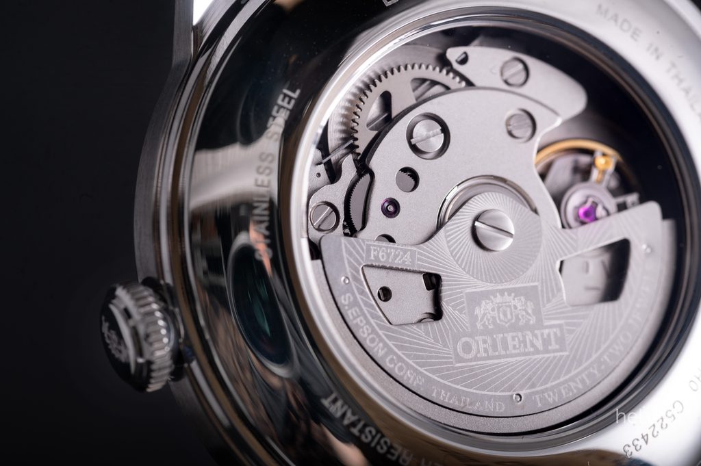 Hodinky Orient Bambino RA-AC0023E30B poháňa samonavíjací mechanický strojček Orient F6724 s rezervou chodu 40 hodín. Strojček disponuje aj funkciou zastavenia sekundovej ručičky pri nastavovaní hodiniek (tzv. hacking) a ručným naťahovaním. Mnohých určite poteší možnosť sledovať činnosť strojčeka, ktorý pracuje s frekvenciou 21600 polomerov za hodinu, vďaka priehľadnému vieku.