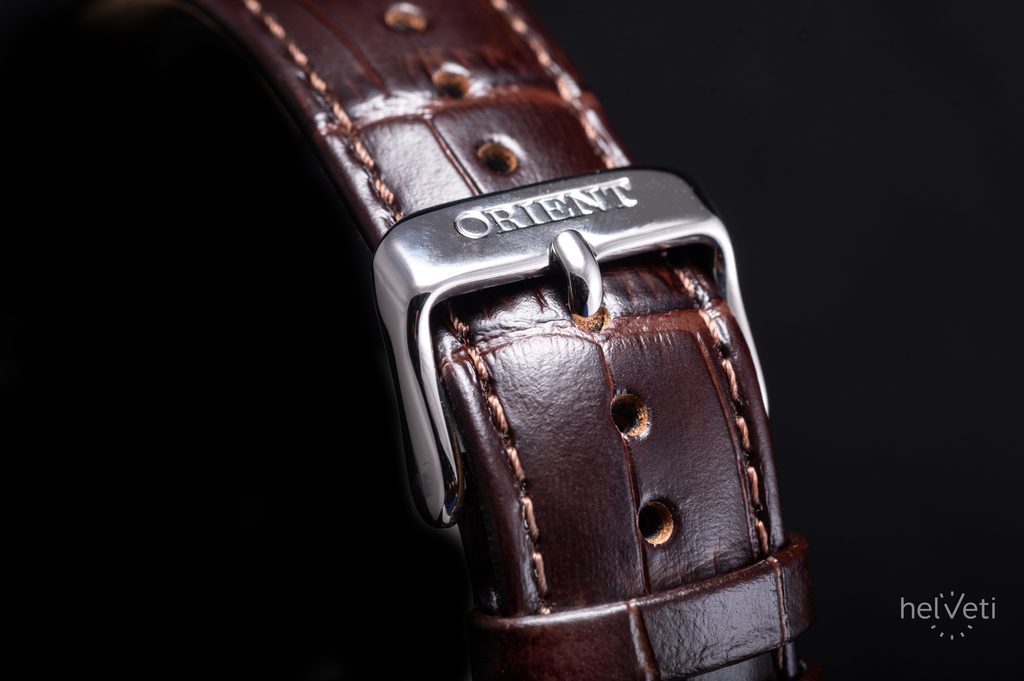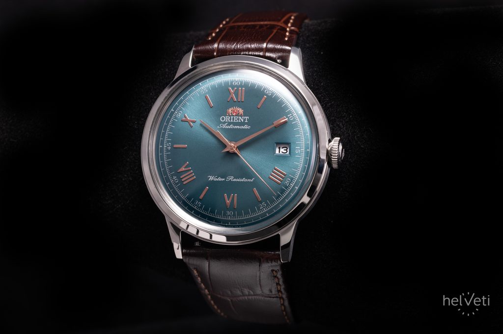Charakteristickými znakmi hodiniek Orient Bambino sú klenuté sklo, zakrivený ciferník a celkovo jednoduché línie a klasický vzhľad. Zelený ciferník s retro nádychom sa cení pre dobrú prehľadnosť a je chránený minerálnym sklíčkom. Ciferník poteší detailmi v podobe jemnej slnečnej úpravy, reliéfnych indexov na pozíciách hodín alebo ručičiek z ružového zlata dauphine. Hodinky sú vybavené ukazovateľom dátumu na pozícii 3 hodín. Vodotesnosť tohto modelu je 30 m, takže hodinky vydržia kontakt s vodou pri umývaní rúk aj pri daždi. Oceľové puzdro dopĺňa hnedý kožený remienok s krokodílím vzorom. S priemerom puzdra 40,5 mm dokonale padne na väčšinu pánskych zápästí.