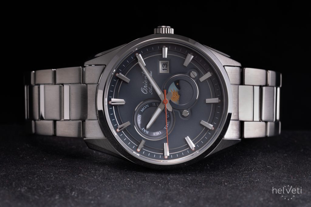 Sivý ciferník s efektom slnečného lúča a aplikovanými indexmi na hodinových pozíciách je chránený zafírovým sklíčkom s vysokou odolnosťou proti poškriabaniu. Povrch ciferníka vhodne oživuje oranžová sekundová ručička a denná ručička. Vodotesnosť tohto modelu je 50 m, takže hodinky bez problémov vydržia bežný kontakt s vodou, napríklad dážď a umývanie rúk. Na lepšiu čitateľnosť za zhoršených svetelných podmienok sú hodinky vybavené luminiscenčnými ručičkami a bodkami na indexoch. Hodinky sa dodávajú na oceľovom náramku, ktorý má v porovnaní s remienkami dlhšiu životnosť a robí hodinky univerzálnejšími. Priemer puzdra je 41,5 mm.