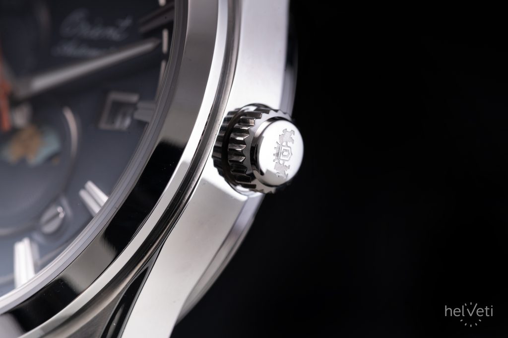 Modely Orient Stretto vychádzajú z dizajnu obľúbeného modelu Semi Skeleton, pričom sa inšpirujú mestskou krajinou. Klinovité indexy pripomínajú výškové budovy, zatiaľ čo kruhová priehlbina pod indexmi predstavuje krivky, ktoré sa často vyskytujú v modernej architektúre. Brúsený povrch puzdra a náramku vhodne prerušujú leštené prvky, ktoré zvýrazňujú línie hodiniek.