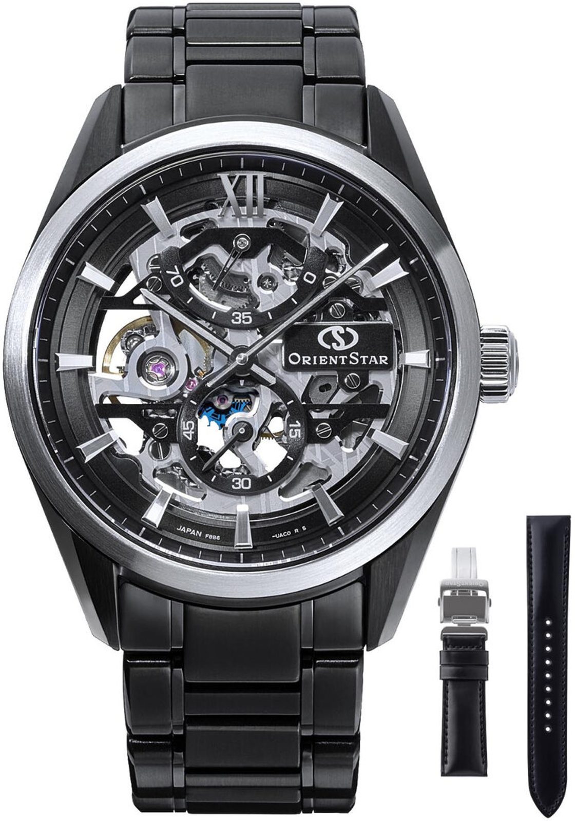 Hodinky vynikajú úrovňou remeselného spracovania, nezameniteľným dizajnom, líniami a detailmi puzdra a ciferníka. Oceľové puzdro hodiniek Orient RE-AZ0105N00B dopĺňa sofistikovaný oceľový náramok zakončený skladacou sponou, oba s čiernou PVD úpravou. Súčasťou balenia je aj čierny remienok z kordánovej kože ukončený skladacím zapínaním.