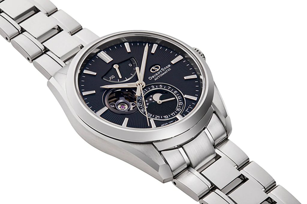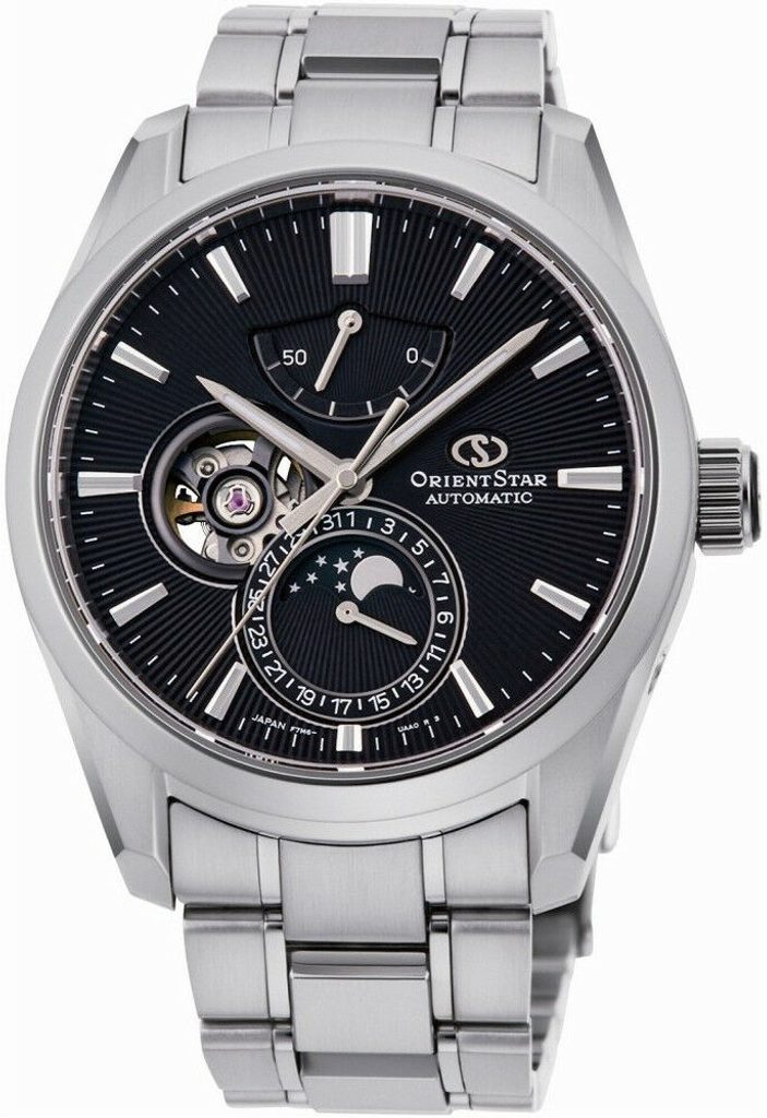 Hodinky Orient Star RE-AY0001B Contemporary Moon Phase majú neobvyklý, ale čistý ciferník a elegantný dizajn, vďaka ktorému sú vhodným doplnkom ku košeli alebo saku. Môže sa však používať aj na každodenné nosenie. Pri tvorbe nových ciferníkov sa dizajnéri inšpirovali vesmírom.