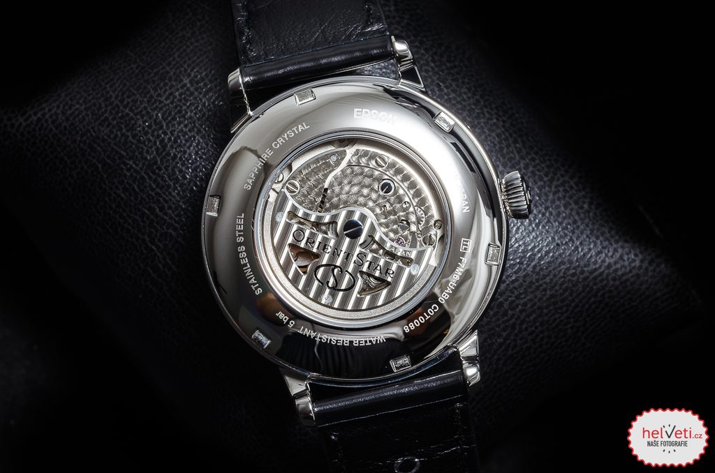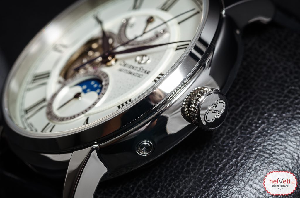 Hodinky vynikajú úrovňou remeselného spracovania, nezameniteľným dizajnom, líniami a detailmi puzdra, náramku a ciferníka. Puzdro hodiniek Orient RE-AY0106S00Bje vyrobené z nehrdzavejúcej ocele. Vnútri sa nachádza mechanický strojček Orient F7M62, ktorý je vybavený automatickým naťahovaním a rezervou chodu 50 hodín. Tento strojček je tiež vybavený zastavením sekundovej ručičky pri nastavení hodiniek ( hacking) a zaujímavou komplikáciou je ukazovateľ rezervy náťahu na 12. hodine. Mnohých určite poteší zotrvačník na pozícii 9 hodín, takzvané "otvorené srdce" a ukazovateľ dátumu s fázou mesiaca zobrazenou na subciferníku na pozícii 6 hodín. Strojček pracujúci s frekvenciou 21 600 polorytmov za hodinu je možné pozorovať vďaka priehľadnému vieku. Vieko je chránené zafírovým sklíčkom.