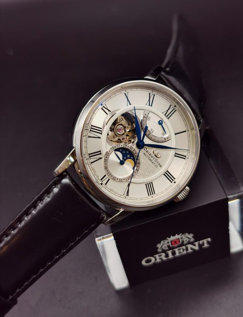 Hodinky Orient RE-AY0106S Classic Moon Phase ponúkajú neobvyklý, ale čistý ciferník a elegantný dizajn, vďaka ktorému sú hodinky vhodným doplnkom ku košeli alebo saku. Môže sa však používať aj na každodenné nosenie.