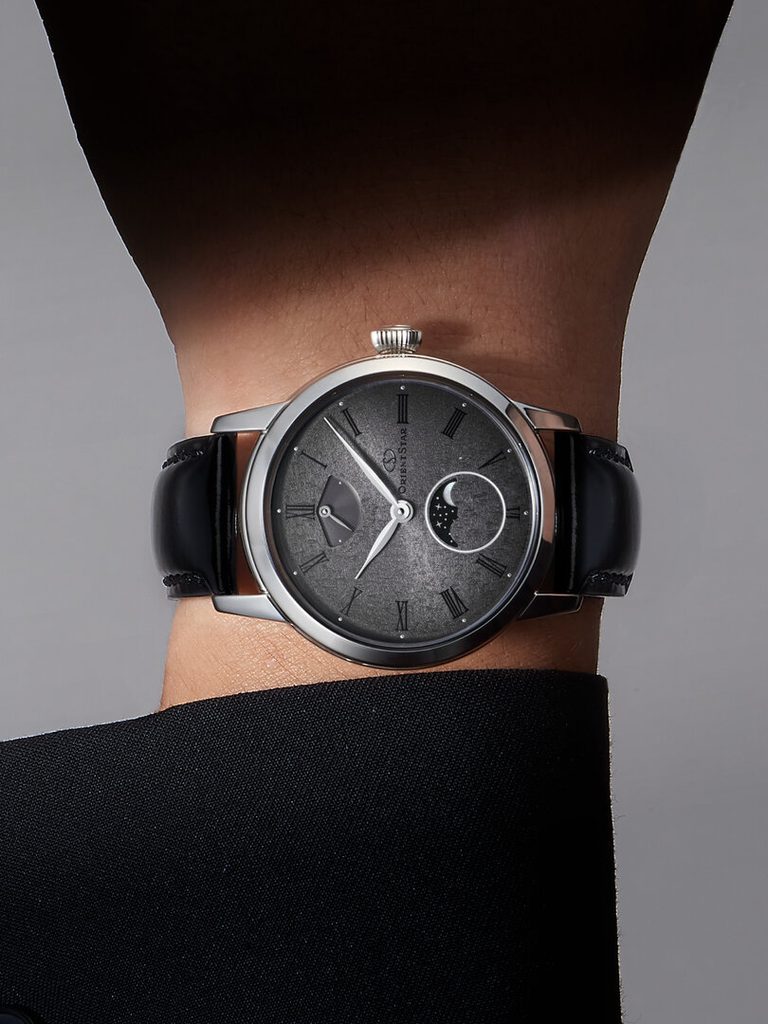 Vybrané ciferníky Orient Star sa vyznačujú zložitými výrobnými procesmi a pokročilými technológiami. V tomto modeli sú na povrch ciferníka najprv vyrazené vzory znázorňujúce hviezdy. Jemné vzory menia svoju podobu v závislosti od uhla, pod ktorým svetlo dopadá na povrch, a vytvárajú scénu trblietajúcich sa hviezd. Potom sa na povrch nanesie farba, ktorej hustota je jemne upravená tak, aby sa dosiahol prechod od sivej v strede ciferníka k čiernej, ktorá sa objavuje smerom k vonkajšiemu okraju. Lakovaný povrch je navyše potiahnutý médiom, ktoré sivému ciferníku dodáva hĺbku nočnej oblohy a vesmíru.