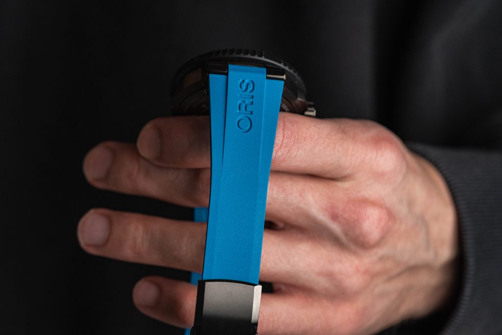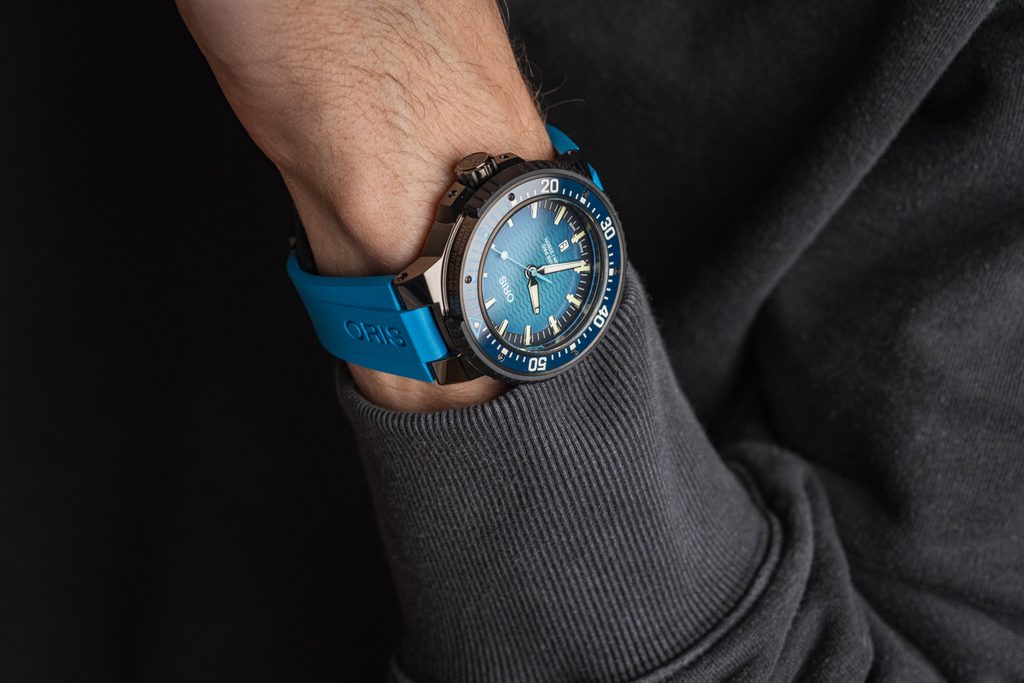 Puzdro hodiniek Oris Aquis Pro 1000M 49,5 mm 01 733 7801 7255-Set je vyrobené z titánu s PVD úpravou a je doplnené gumovým remienkom. Súčasťou balenia je aj prídavný gumový remienok. V jeho vnútri spoľahlivo pracuje švajčiarsky mechanický strojček Oris 733 (na báze Sellita SW200-1) s automatickým naťahovaním. Tento strojček má vo vnútri 26 uložených kameňov a pracuje s frekvenciou 28 800 polofrekvencií za hodinu (4 Hz). Praktický ukazovateľ dátumu sa nachádza na pozícii 6.