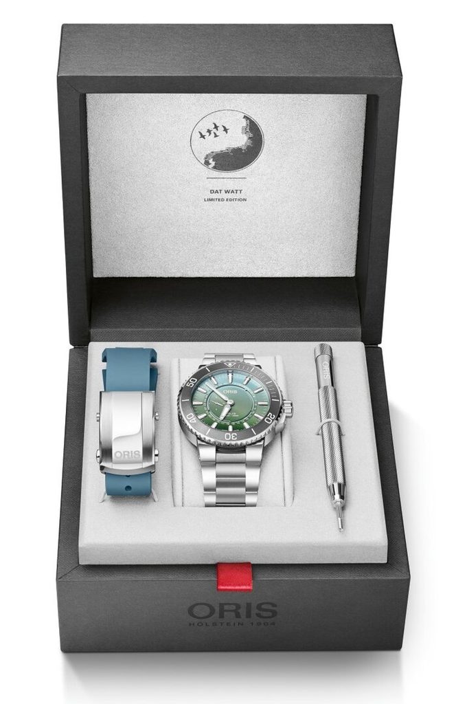 Švajčiarske hodinky Oris Aquis Small Second Date 43,5 mm Dat Watt Limited Edition II 01 743 7734 4197-Set zaujmú špecifickým, veľmi atraktívnym "potápačským" dizajnom a vynikajúcim spracovaním. Tento model výborne poslúži nielen pod vodou, ale aj pri každodennom nosení. Tento model bol vyrobený v limitovanej edícii iba 2009 kusov pre celý svet. Je venovaný partnerstvu spoločnosti Oris s organizáciou Common Wadden Sea Secretariat (CWSS), ktorá pomáha chrániť Waddenské more.