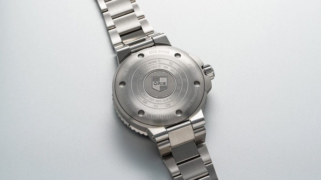 Puzdro hodiniek Oris Aquis Small Second Date 0174377334155-0782405PEB je vyrobené z ušľachtilej ocele, rovnako ako náramok. V jeho vnútri spoľahlivo pracuje švajčiarsky mechanický strojček Oris 743 (vychádzajúci z modelu Sellita SW220-1) s automatickým naťahovaním. Tento strojček má v sebe 26 uložení kameňov a pracuje s frekvenciou 28 800 polfrekvencií za hodinu (4 Hz). Na pozícii 3 nájdeme praktický ukazovateľ dátumu a na pozícii 9 nájdeme mimostredovú sekundovú ručičku. Na meranie časových úsekov sa používa jednosmerne rotujúca keramická potápačská luneta.
