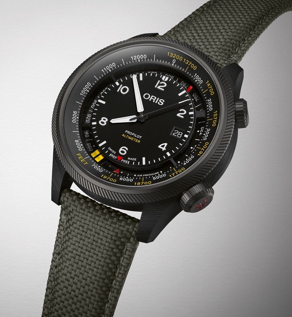 Puzdro hodiniek Oris ProPilot Altimeter 0179377758734-Set je vyrobené z jedinečného karbónu a je doplnené remienkom z textilnej kože. Luneta je zdobená typickým vrúbkovaním, ktoré symbolizuje turbínu leteckého motora. Remienok je vybavený špeciálnou patentovanou prackou s názvom "Lift", ktorá je štýlovo riešená ako pracka bezpečnostného pásu lietadla. Luneta je vyrobená z titánu s čiernou PVD úpravou. Puzdro bolo vyvinuté a vyrobené v spolupráci so spoločnosťou 9T Labs so sídlom v Zürichu. Tá sa špecializuje na návrh a vývoj výrobných riešení pre pevnejšie a ľahšie súčiastky pre letecký a automobilový priemysel s dôrazom na minimálny vplyv na životné prostredie. Oris bol prvou značkou hodiniek, ktorá spolupracovala s 9T Labs. Tento materiál puzdra nenájdete na žiadnom inom modeli hodiniek. Karbón spoločnosti 9T Labs poskytuje výnimočnú pevnosť (väčšiu ako kov) pri hmotnosti plastu. Napriek väčším rozmerom vážia hodinky len 98 gramov.