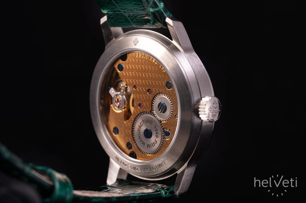 Zaujímavé detaily nájdete aj na spodnej strane hodiniek. Pod skleneným krytom sa ukrýva manufaktúrny strojček PRIM kalibru 103.00 s manuálnym naťahovaním. Originálnym prvkom je zdobenie strojčeka malým reliéfom, ktorý pripomína odtlačok kolesa traktora. Sofistikovaný dizajn hodiniek dotvára remienok z fľaškovozelenej kože aligátora.