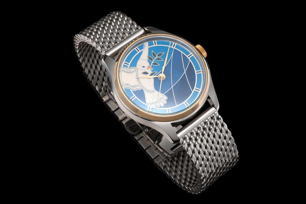 Detailne prepracovanú bielu holubicu, ktorej plastickosť dodáva jemné tieňovanie krídel, dopĺňa paleta modrých odtieňov na nevšednom ciferníku. Na výrobu ciferníka sme použili technológiu HyCeram, ktorá je veľmi časovo náročná a predovšetkým precízna. Precízne nanášanie alebo pokrývanie jednotlivých prvkov rôznymi farbami predstavuje viac ako 12 hodín sústredenej práce. Výslednou odmenou je kvalitný, vysoko odolný a farebne stály ciferník krytý zafírovým sklíčkom. Ciferník je majstrovským dielom hodinárskej výroby.