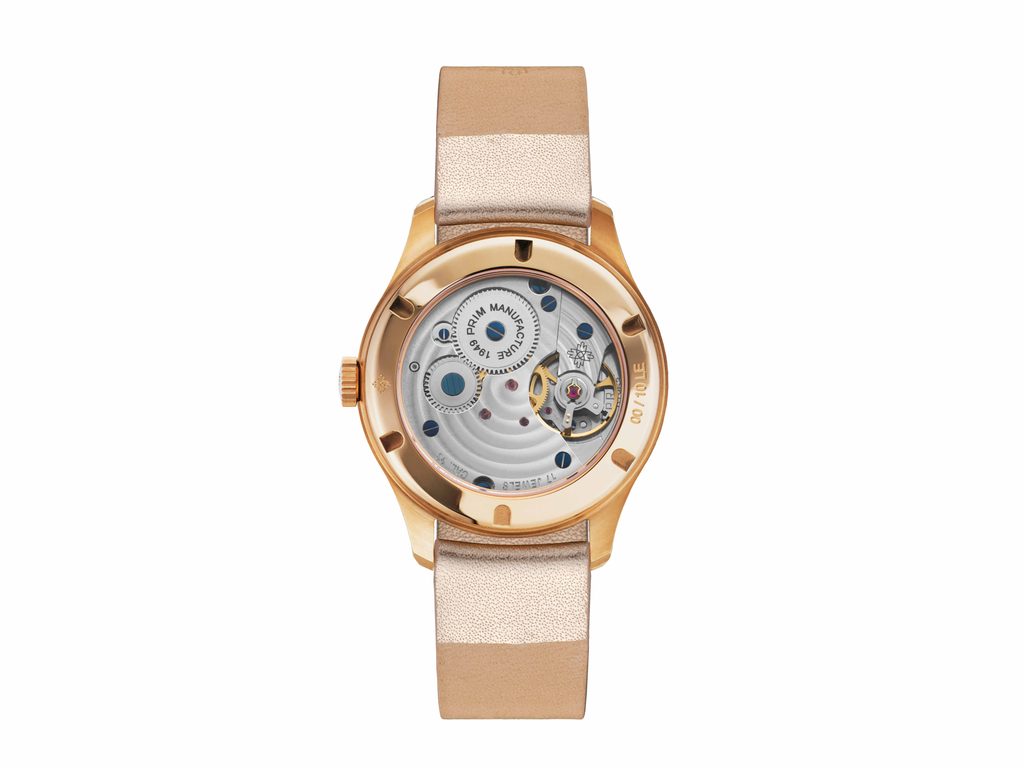 Sklenené puzdro umožňuje fascinujúci pohľad na vlastný mechanický strojček PRIM kalibru 93.00 s ručným naťahovaním - ukážku dokonalej hodinárovej práce.