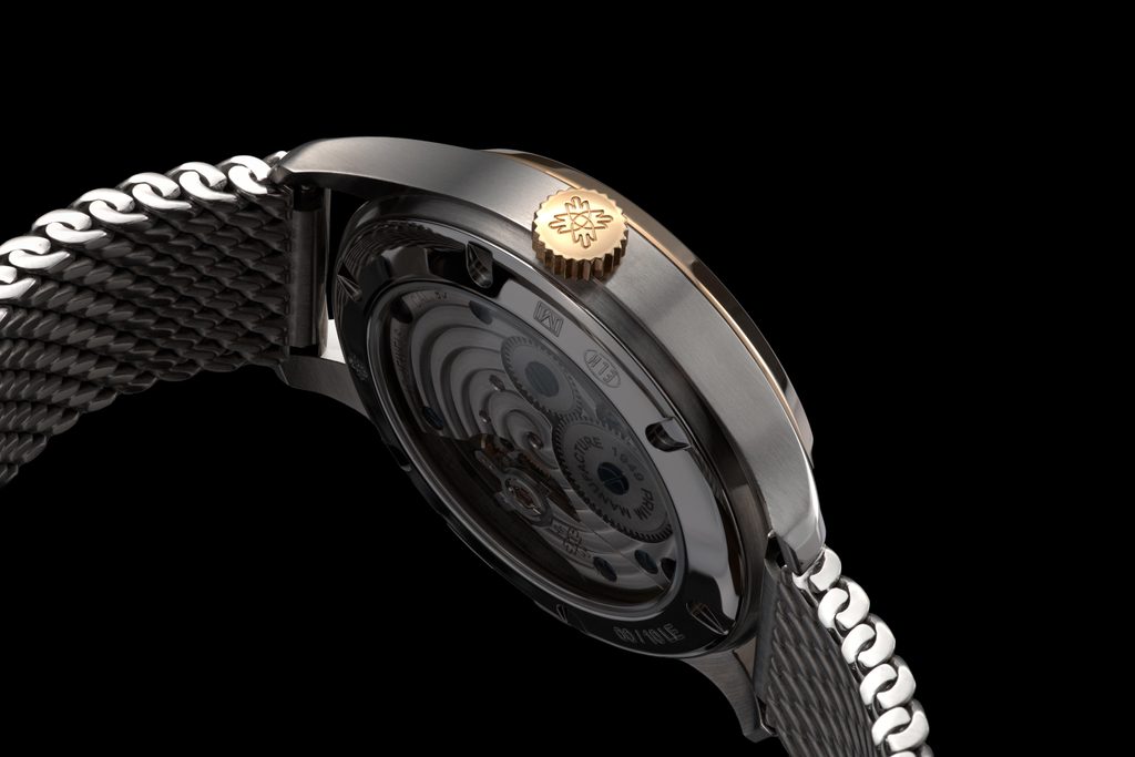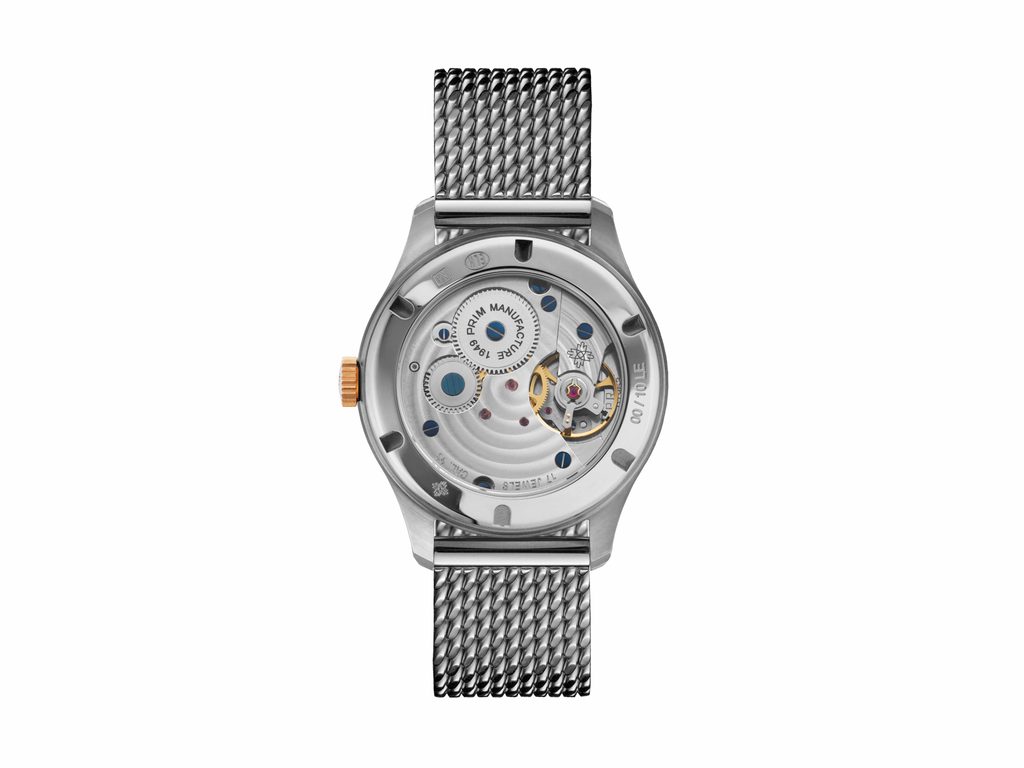 Sklenené puzdro umožňuje fascinujúci pohľad na vlastný mechanický strojček PRIM kalibru 93.00 s ručným naťahovaním - ukážku dokonalej hodinárovej práce.