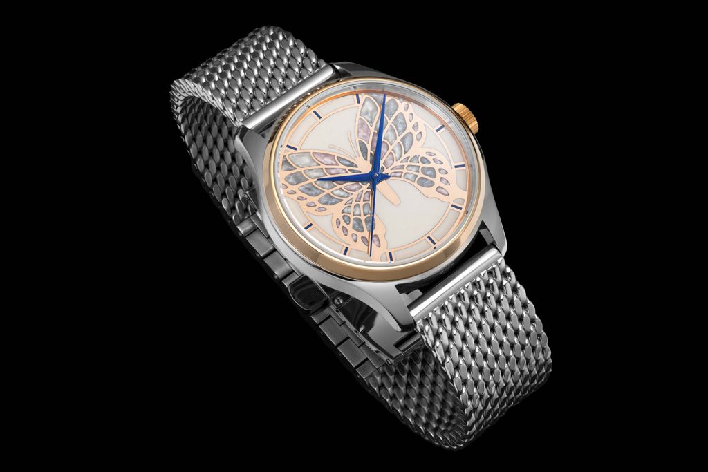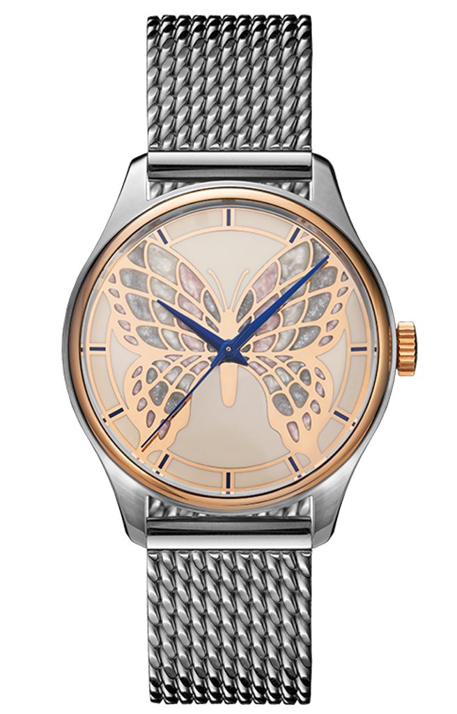 Limitovaná edícia hodiniek PRIM ART 2025 93-205-506-80-1 zaujme pozláteným ciferníkom, zlatou korunkou a zlatou obručou, ktorú zdobí jemná silueta motýlích krídel, ručne vyrobená technológiou HyCeram®. Náročný proces, ktorý si vyžaduje až 24 hodín sústredenej práce, zahŕňa precízne nanášanie jednotlivých vrstiev farby. Použitie špeciálneho materiálu vytvára jemný perleťový lesk, ktorý evokuje povrch skutočných motýlích krídel. Harmoniu farieb dopĺňajú modré ručičky. Výsledkom je ciferník, ktorý sa stáva malým umeleckým dielom a podčiarkuje jedinečnosť každého kusu.