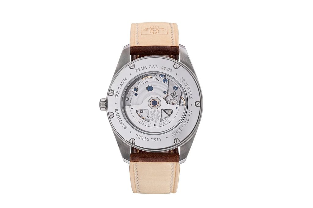 Nadčasovo elegantný dizajn ciferníka a prepracované puzdro, ktoré sa vyznačuje ozdobným frézovaním, nevyjdú z módy ani po desiatkach rokov. Korunku z ušľachtilej ocele zdobí piktogram novomestských oblúkov, ktorý je symbolom prestíže a luxusu náramkových hodiniek s kalibrom 98.00 vlastnej výroby PRIM. Tvar špeciálne brúseného valcovitého zafírového sklíčka zodpovedá pôvodnému tvaru skla. Vodotesnosť hodiniek je 5 ATM.