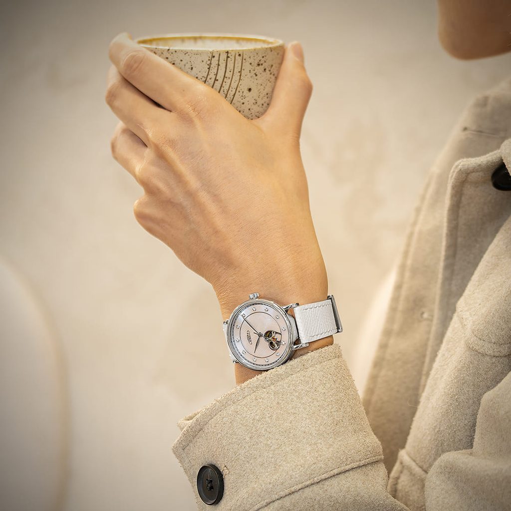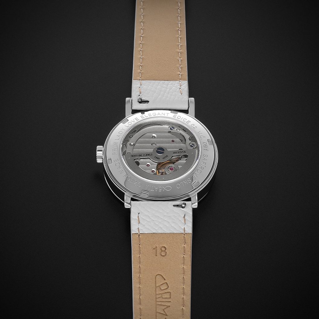 Dizajn dotvárajú ručičky v tvare listov, ktorých ladný tvar a lesk stelesňujú ženskú rafinovanosť. Model PRIM je vyjadrením nežnosti, štýlu a sily v jednom - ideálny doplnok pre ženu, ktorá chce na zápästí nosiť nielen hodinky, ale aj šperk s príbehom.