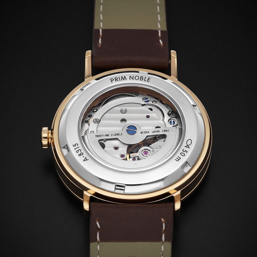 Vo vnútri hodiniek pracuje kvalitný a spoľahlivý japonský strojček Miyota 8315 s automatickým náťahom. Pracuje s frekvenciou 21 600 polfrekvencií za hodinu, má 21 drahokamov a rezervu chodu 42 hodín. Model má aj praktickú funkciu dátumu na pozícii 3 hodín.