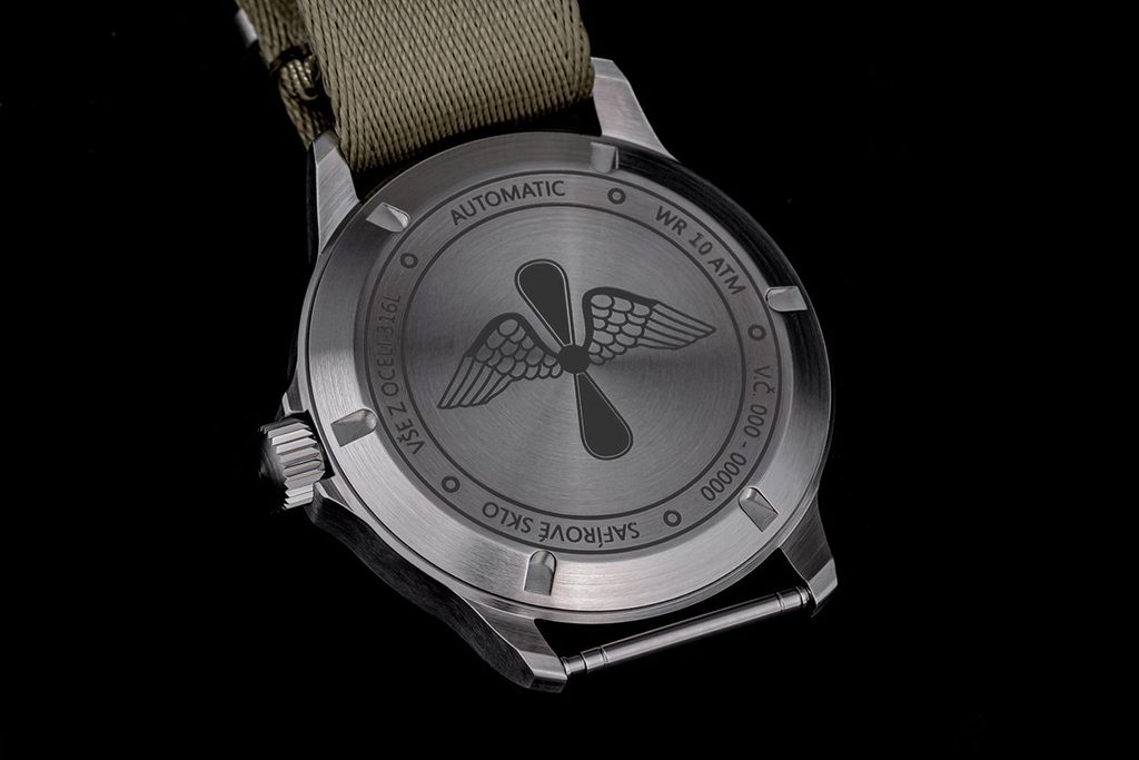 Celému zadnému krytu dominuje dvojlistá okrídlená vrtuľa, odkazujúca na začiatky československého civilného letectva - tento symbol zdobil gombíky predvojnových uniforiem zamestnancov ČSA. Vodotesnosť hodiniek bola zvýšená na 10 ATM, vďaka čomu je model PRIM OK-A vhodný na nosenie aj v náročnejších podmienkach.